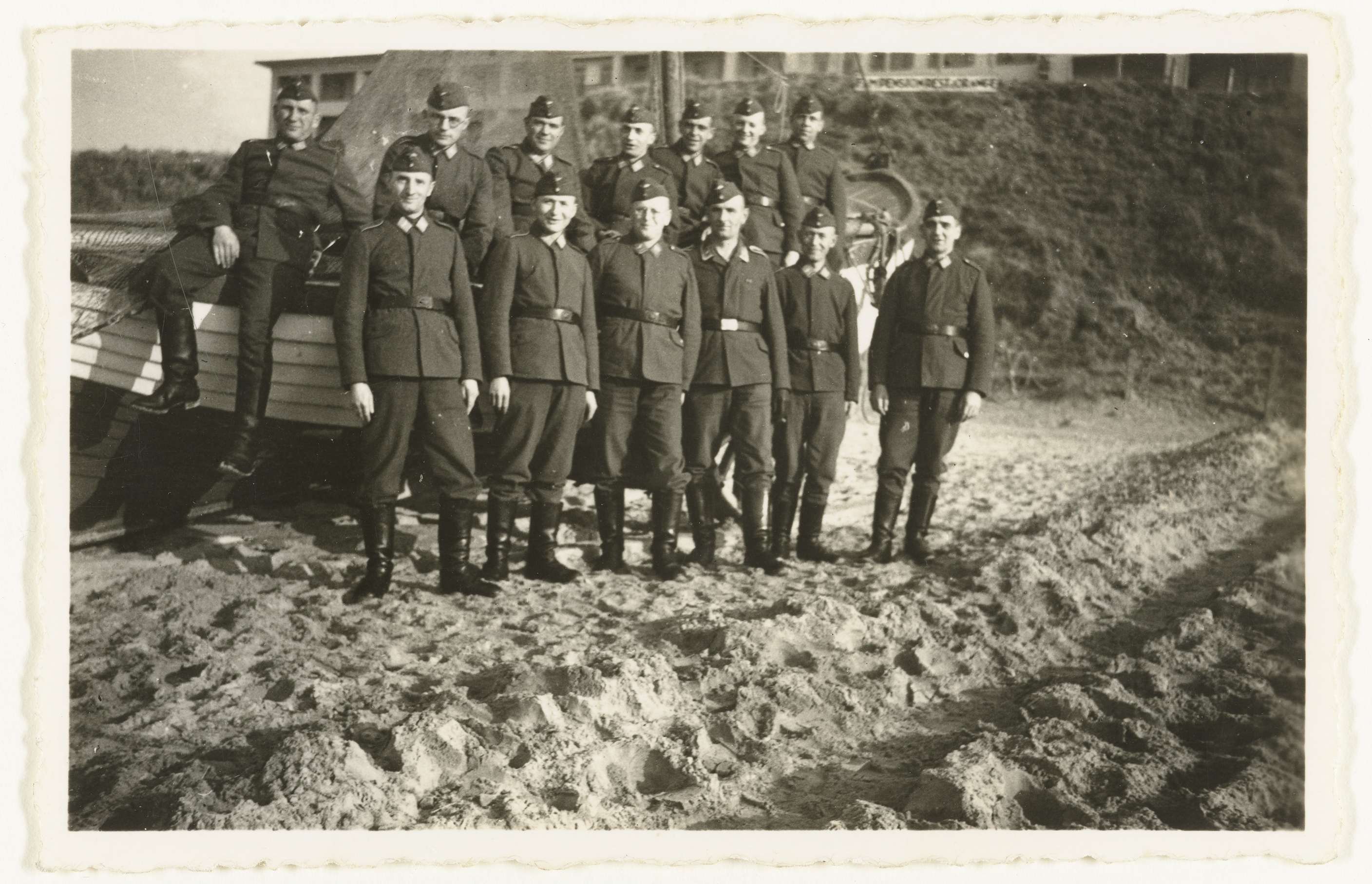 Een groep leden van de Wehrmacht poseert aan het strand, een paar zitten op een houten boot. In totaal 13 man.