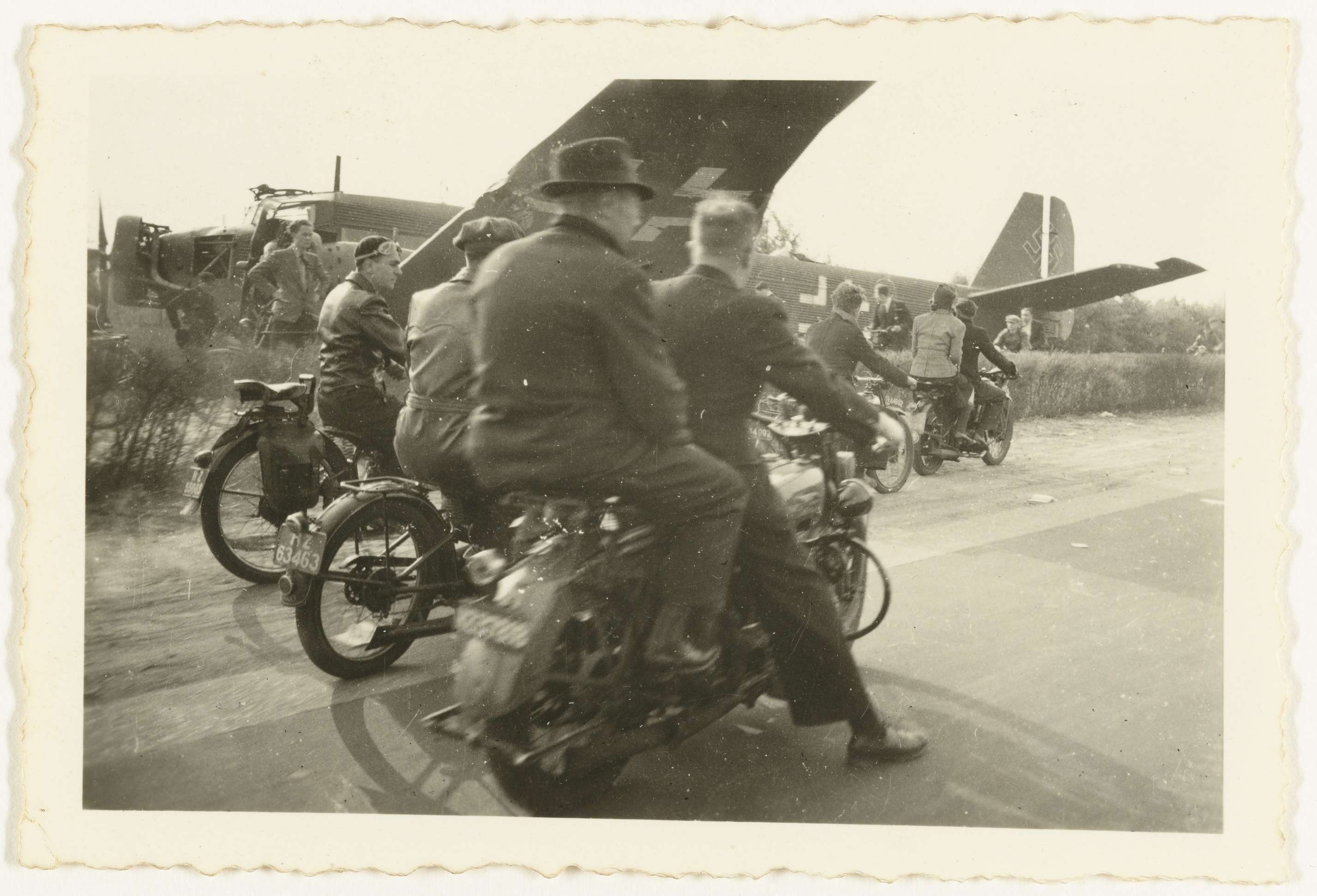 Neergeschoten Duits Junkers 52 Ju transportvliegtuig langs de Rijksweg 13 tussen Rotterdam en Den Haag, nabij Ypenburg. Nederlanders op motorfietsen komen het wrak bekijken.