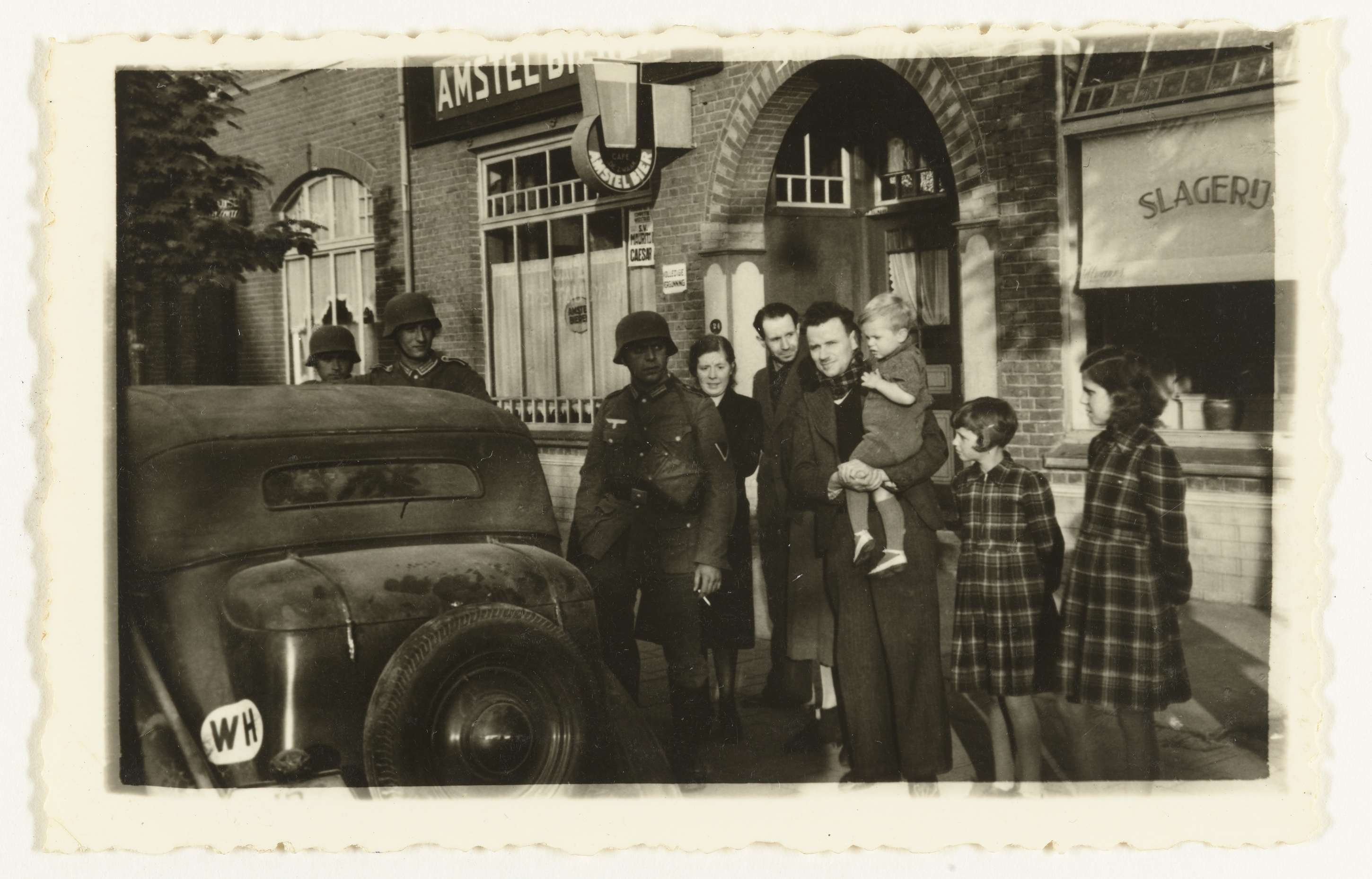 Bij een Duitse? auto staan drie Wehrmachtsoldaten met helmen. Naast hen een Nederlandse vrouw, twee mannen en drie kinderen. De twee meisjes hebben beide een geruite jurk aan. Allen staan voor een café, met rechts een slagerij.
