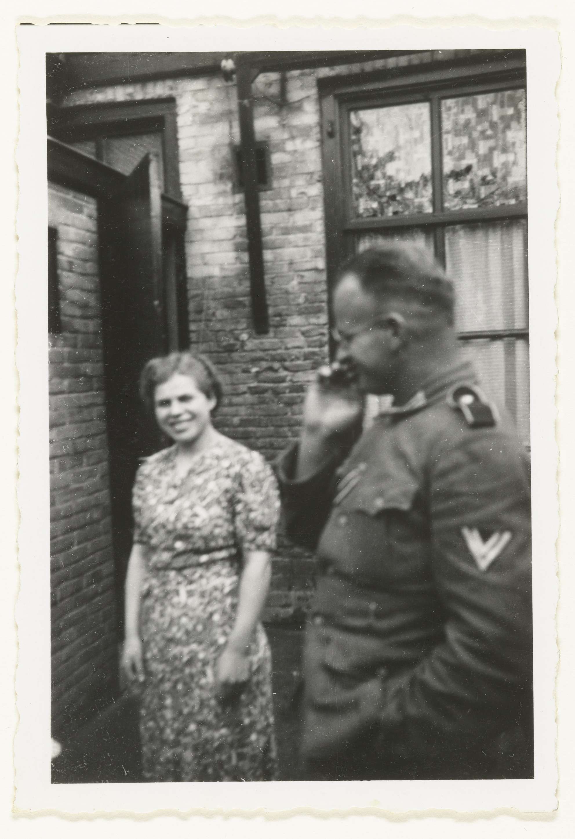 Een Duitse militair met een Nederlandse vrouw bij een huis in Raamsdonksveer. Achterop staat: Holland Sept. 1940. Hermann Ricklets und Adriane Gamers.