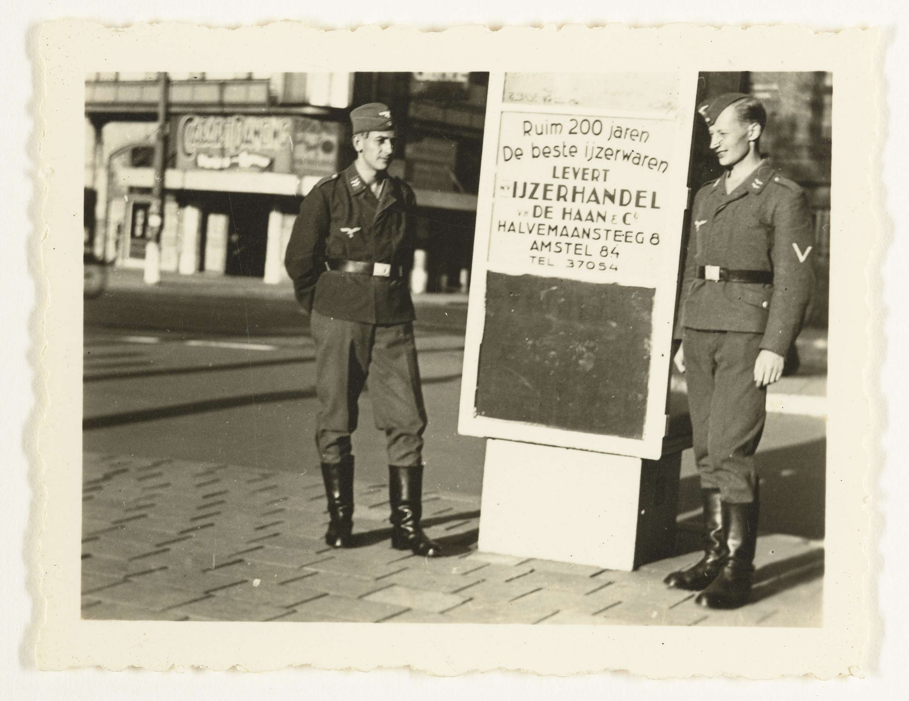 Twee Luftwaffe militairen staan op straat bij een reclamebord voor ijzerhandel De Haan&Co in de Halvemaansteeg in Amsterdam. Zij staan dus op het Rembrandtplein.