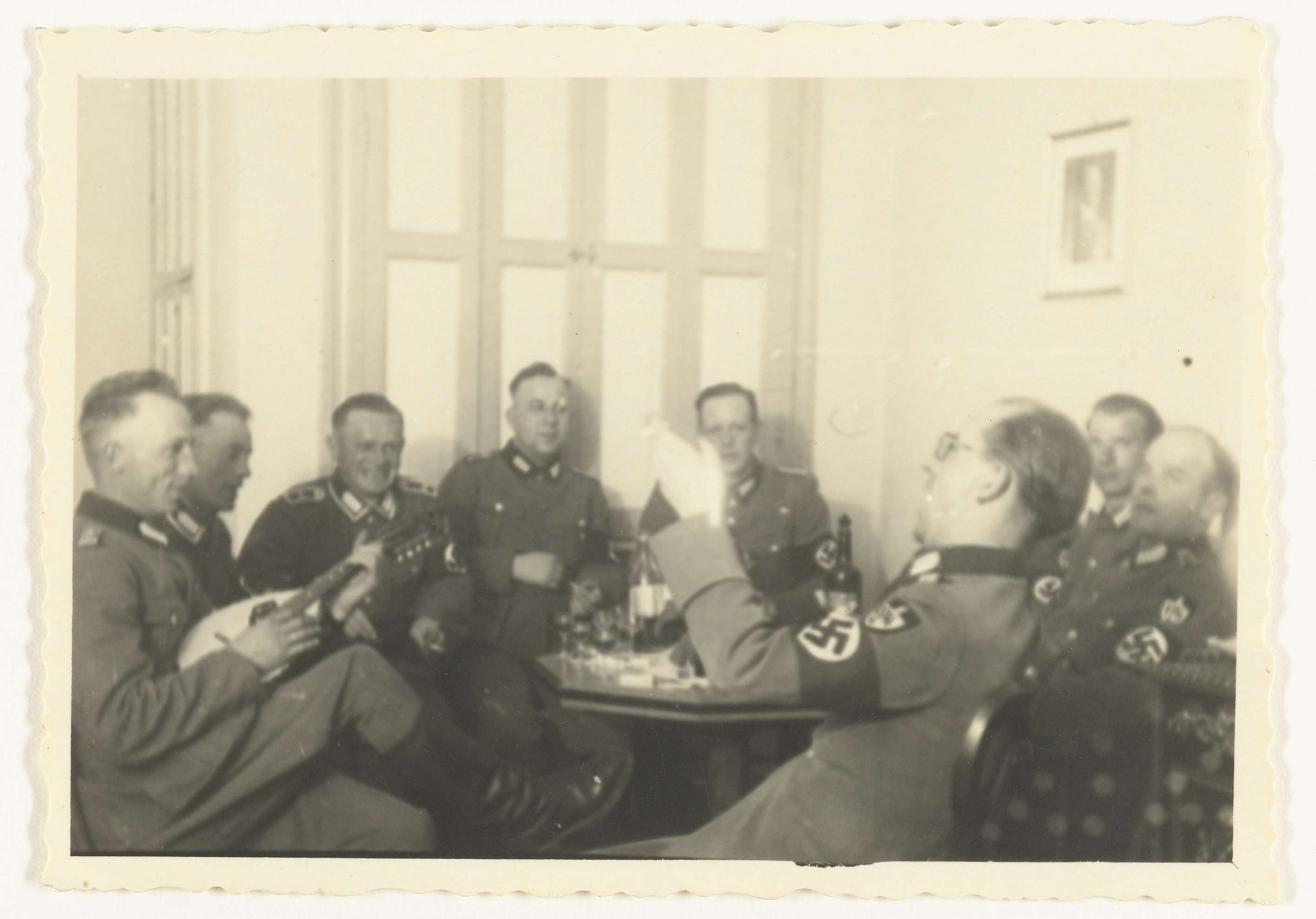Een groep Wehrmacht soldaten (Arbeidsdienst) vieren feest en zingen. Een van hen speelt op een mandoline. Op tafel drank en een kaars in een fles. Aan de muur een portret van A. Hitler.