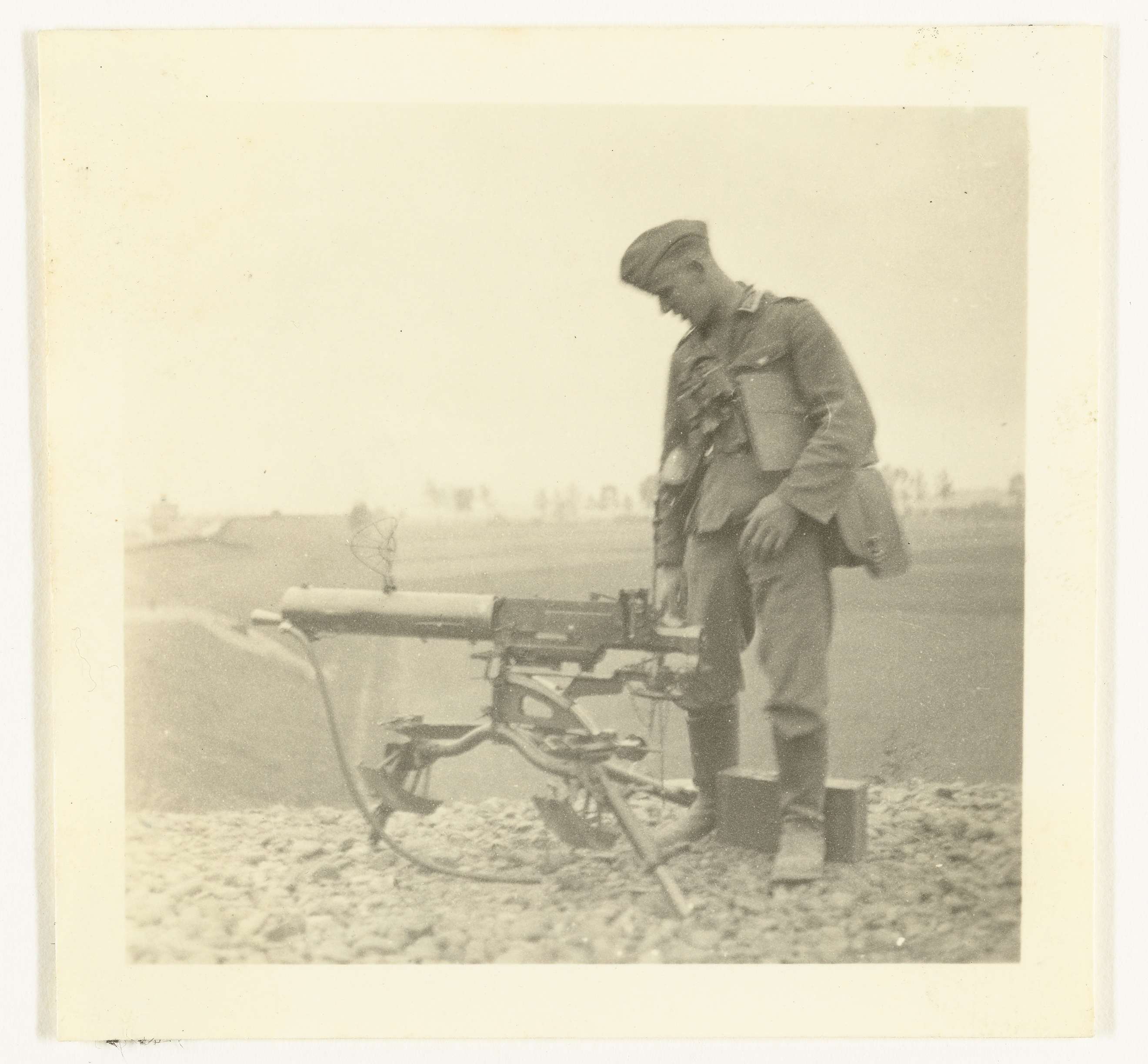 Een Duitse militair staat bij een machinegeweer in een open terrein. Aan zijn voeten staat een kistje.