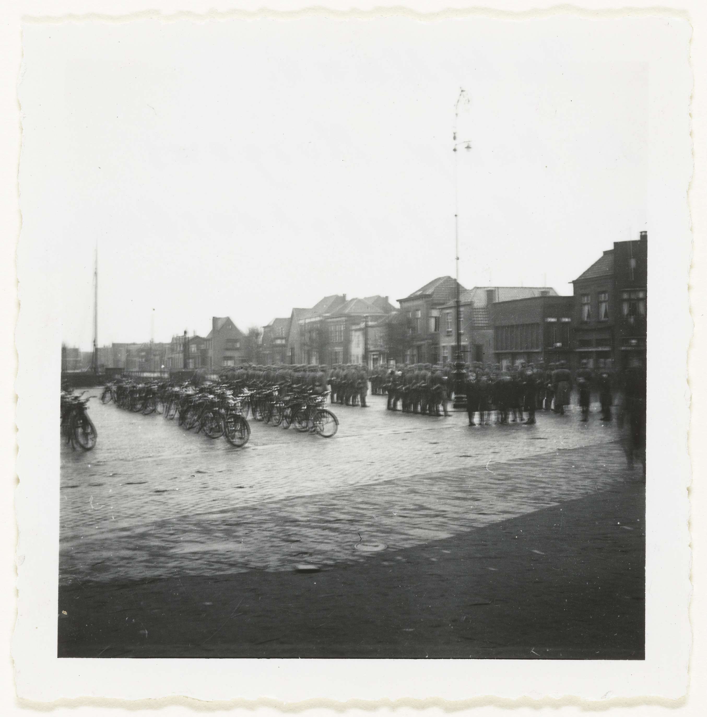 Kompagnie Wehrmacht soldaten staat in rijen met fietsen klaar om op oefening te gaan. Achterop staat: In Holland. Die Komp. Morgens vor Ausfahrt ins Gelände.