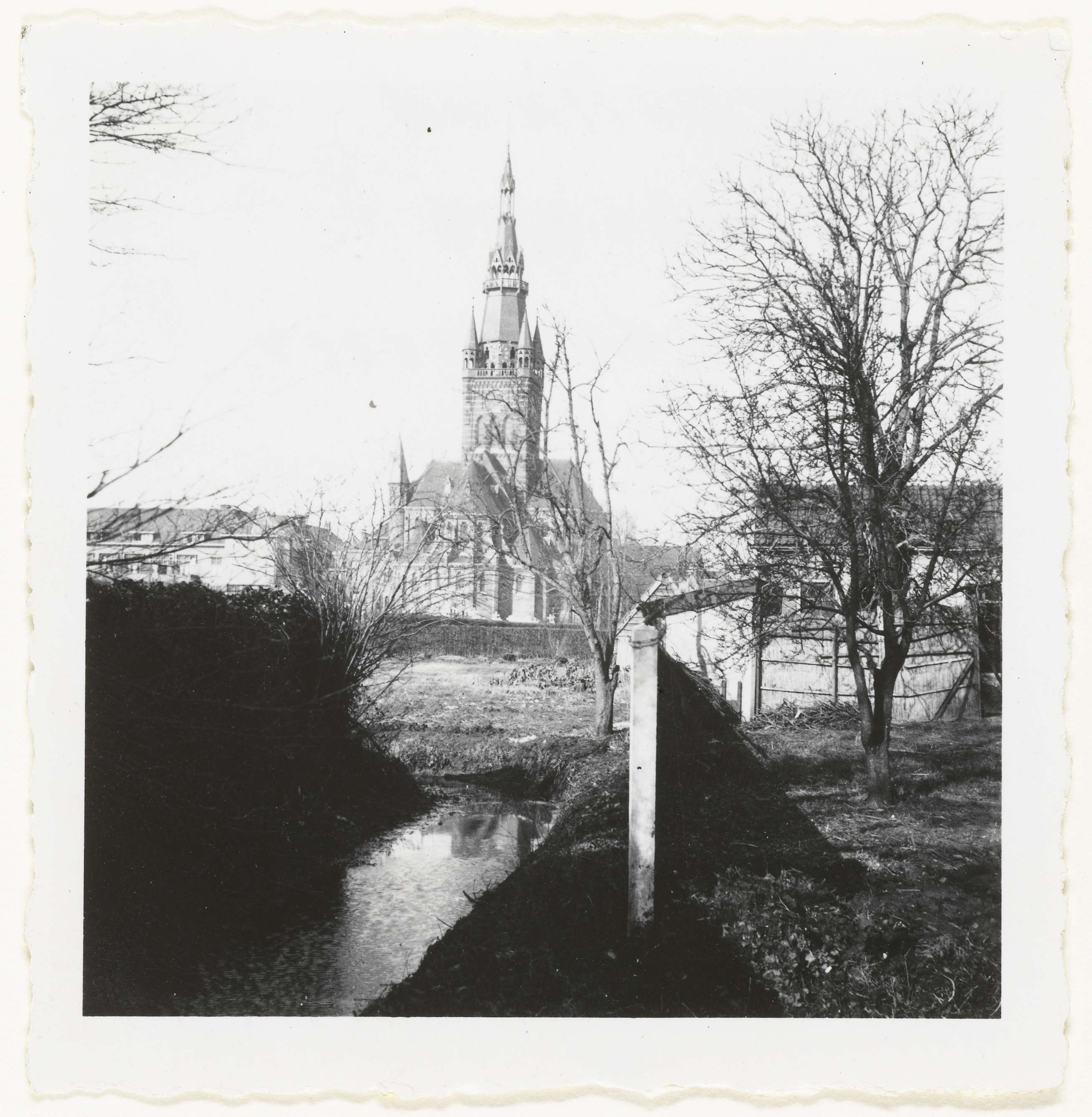 De kerk van Raamsdonksveer. Op de voorgrond een sloot en een huisje. De bomen zijn kaal. De fotograaf van wie veel foto's in deze collectie zitten was waarschijnlijk gelegerd in Raamsdonksveer van september 1940 tot 1941. Hij is te herkennen aan zijn handschrift. Achterop staat: In Holland. Die Kirche von Raamsdonksveer.