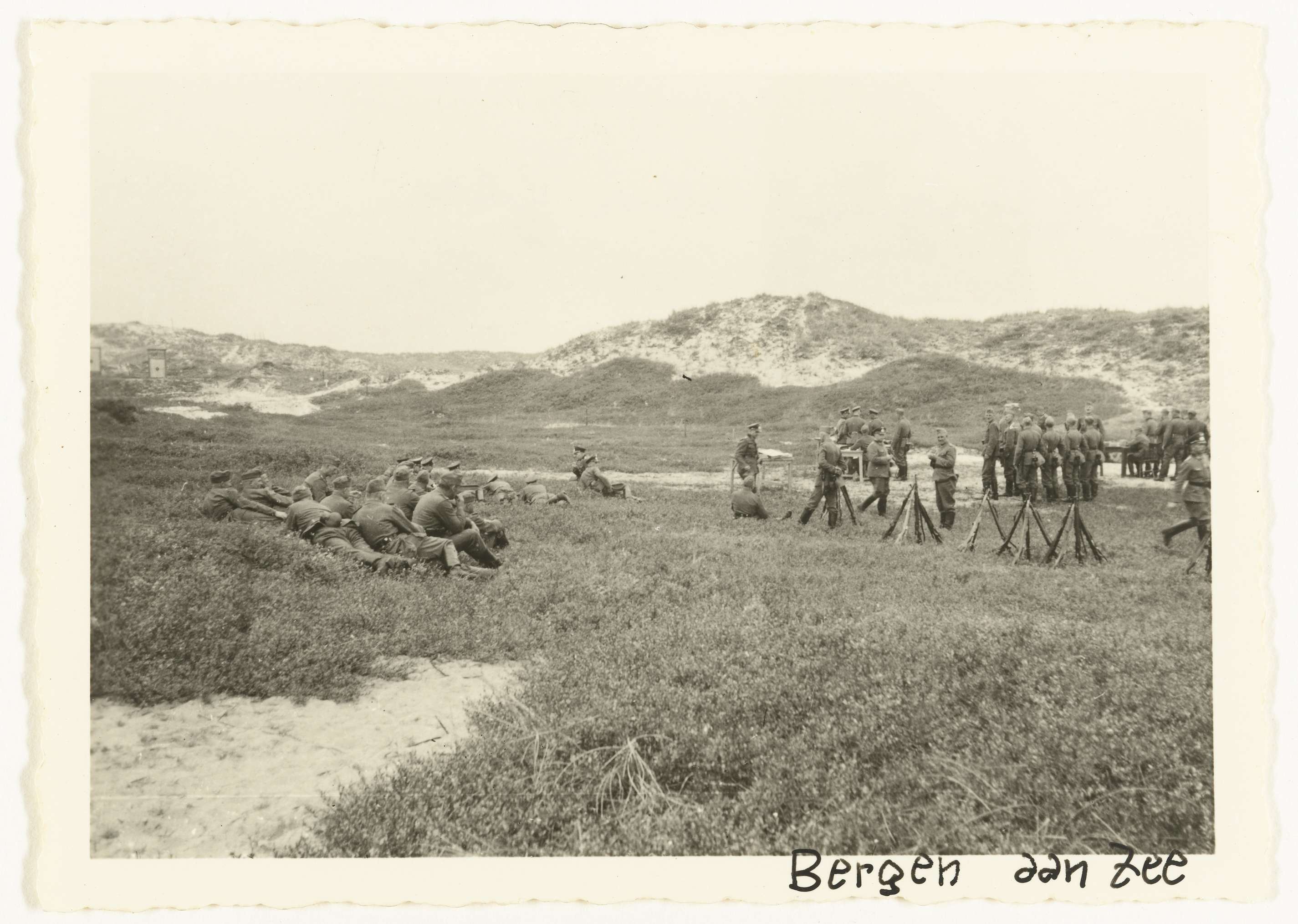 Rust tijdens een oefening van de Wehrmacht in de duinen. Een deel van de manschappen ligt op de grond, anderen staan of zitten aan tafels. De geweren staan tegen elkaar aan op de grond.