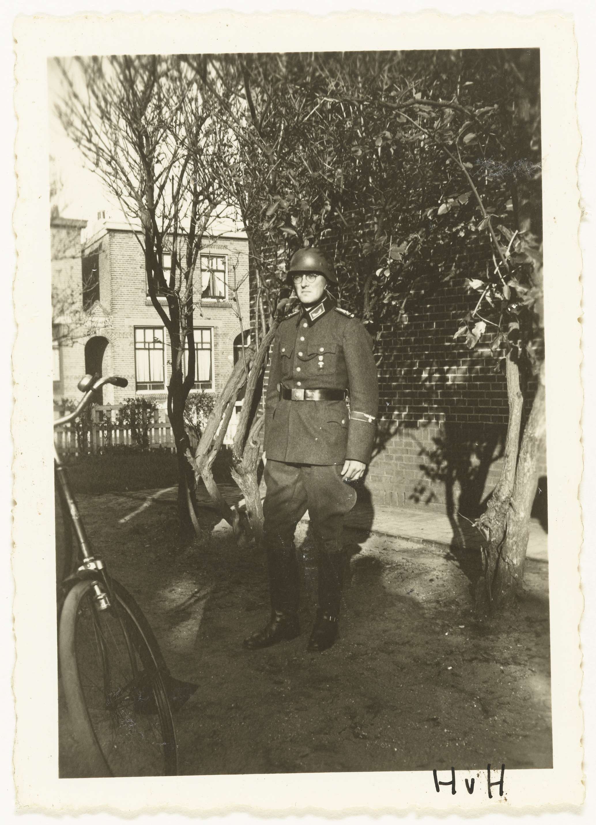Wehrmachtsoldaat bij een huis in de De Ruyterstraat te Hoek van Holland. Hij draagt een helm en een bril. Links staat een fiets.