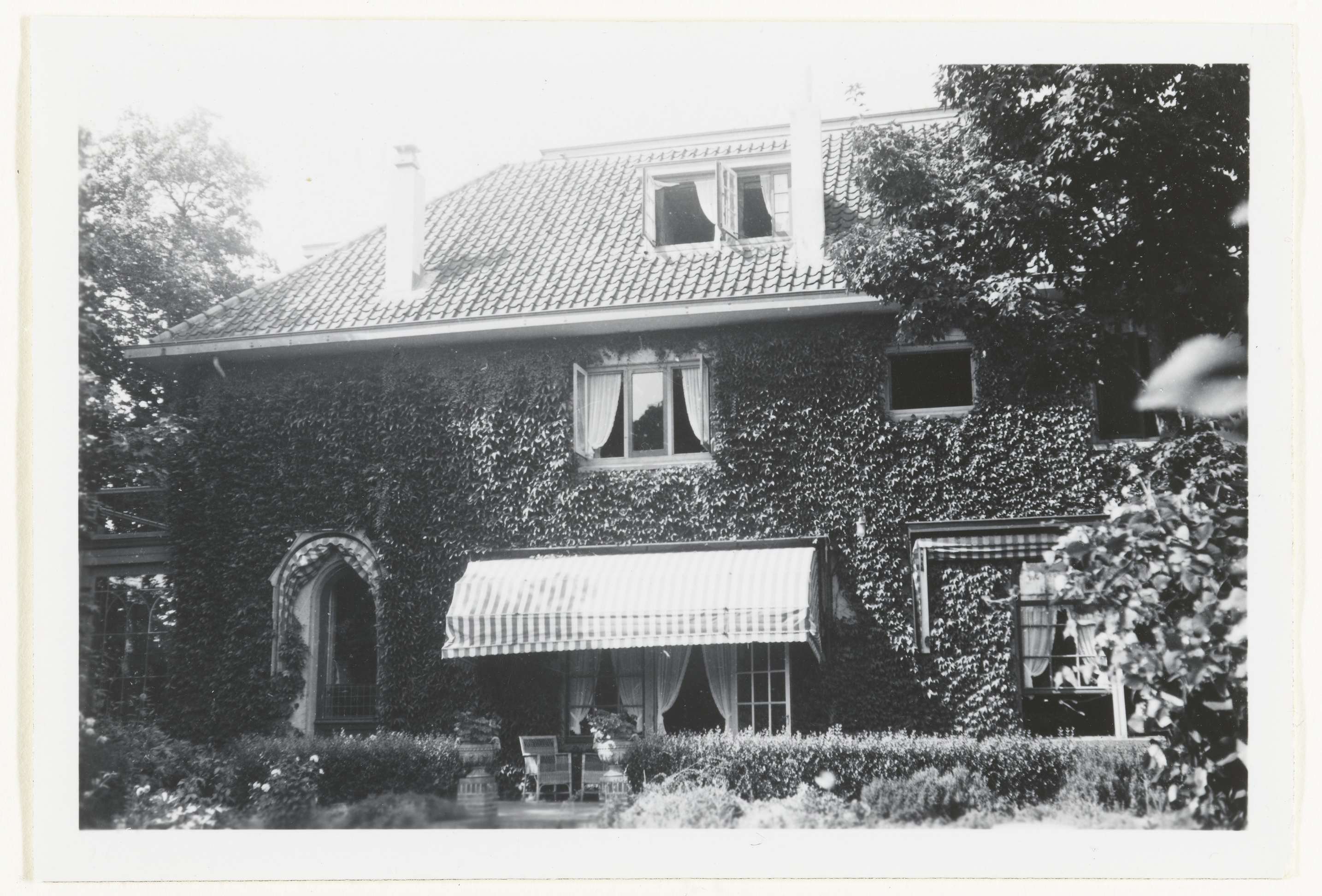 Een villa met een begroeide gevel. Zonwering voor de ramen.