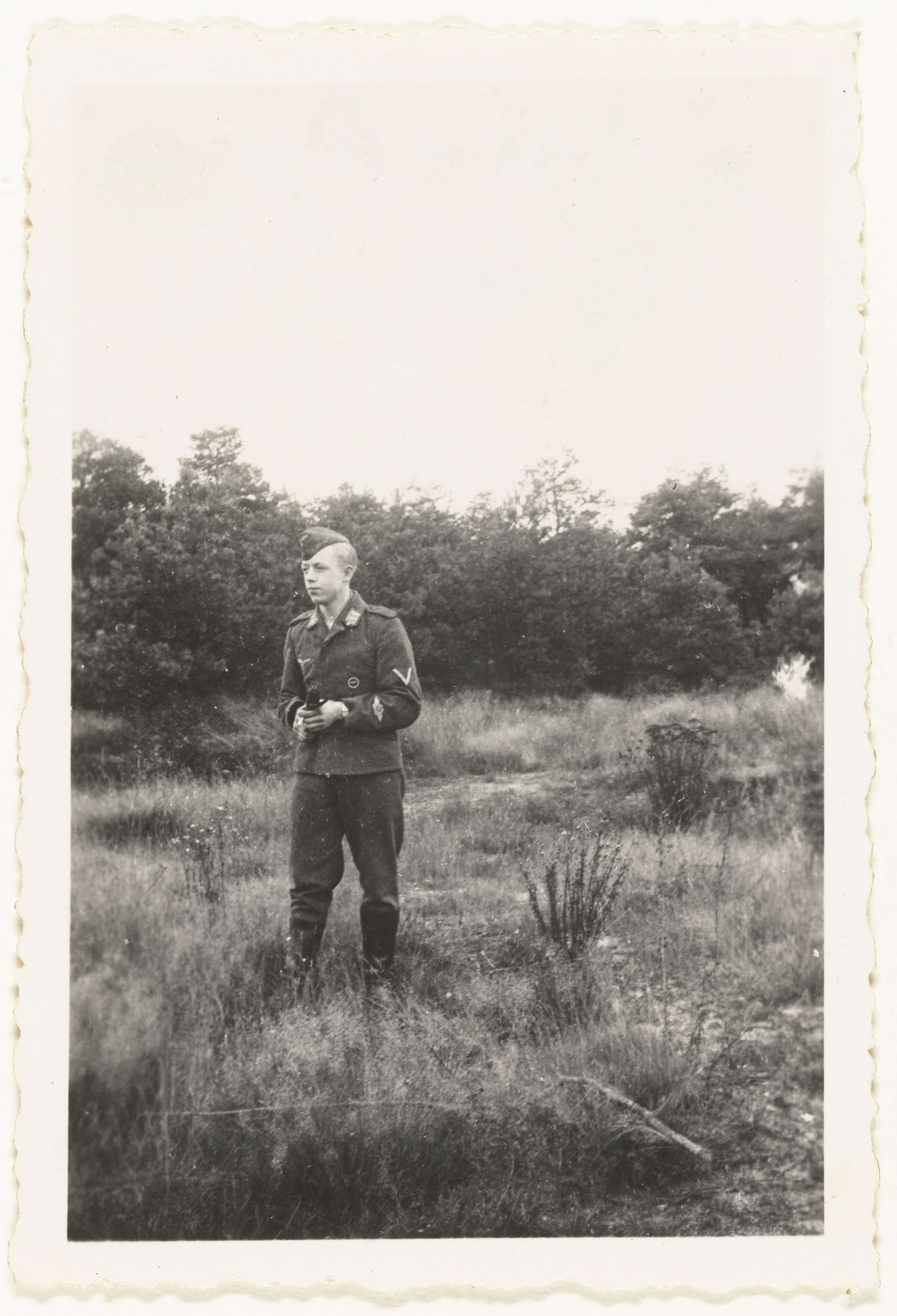 Een Luftwaffe militair in een open, bossig, gebied.