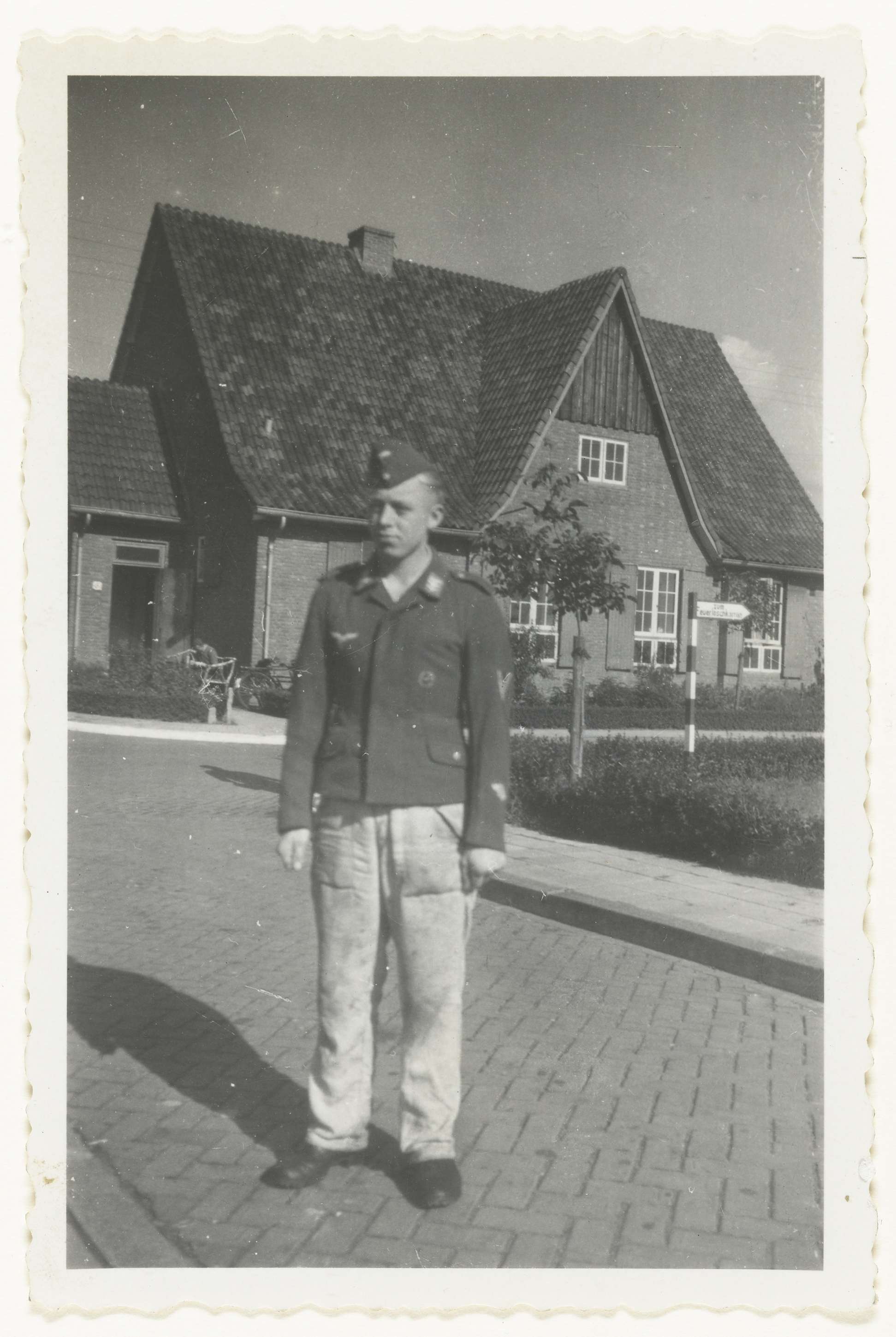 Een Luftwaffe militair in een straat met achter hem een huis.