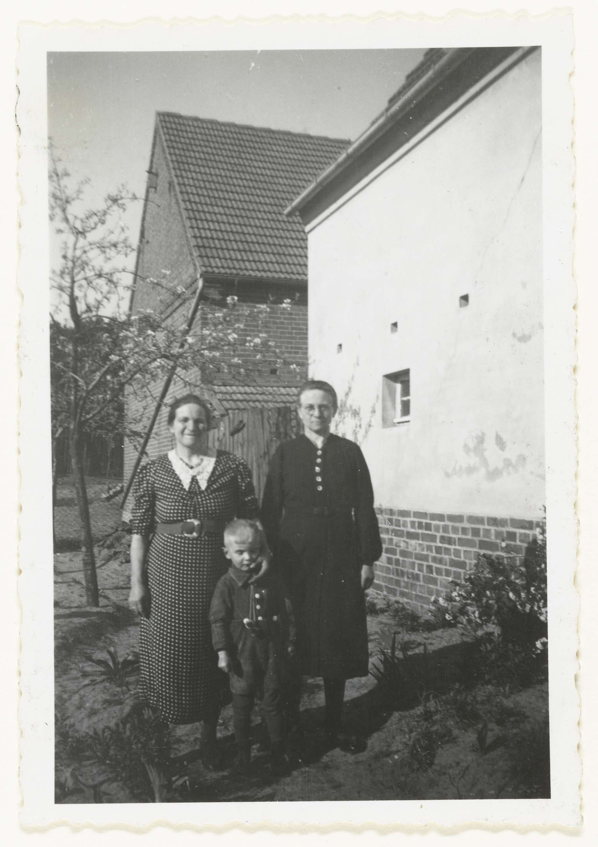 Twee oudere vrouwen en een klein jongetje bij een witte muur van een huis.