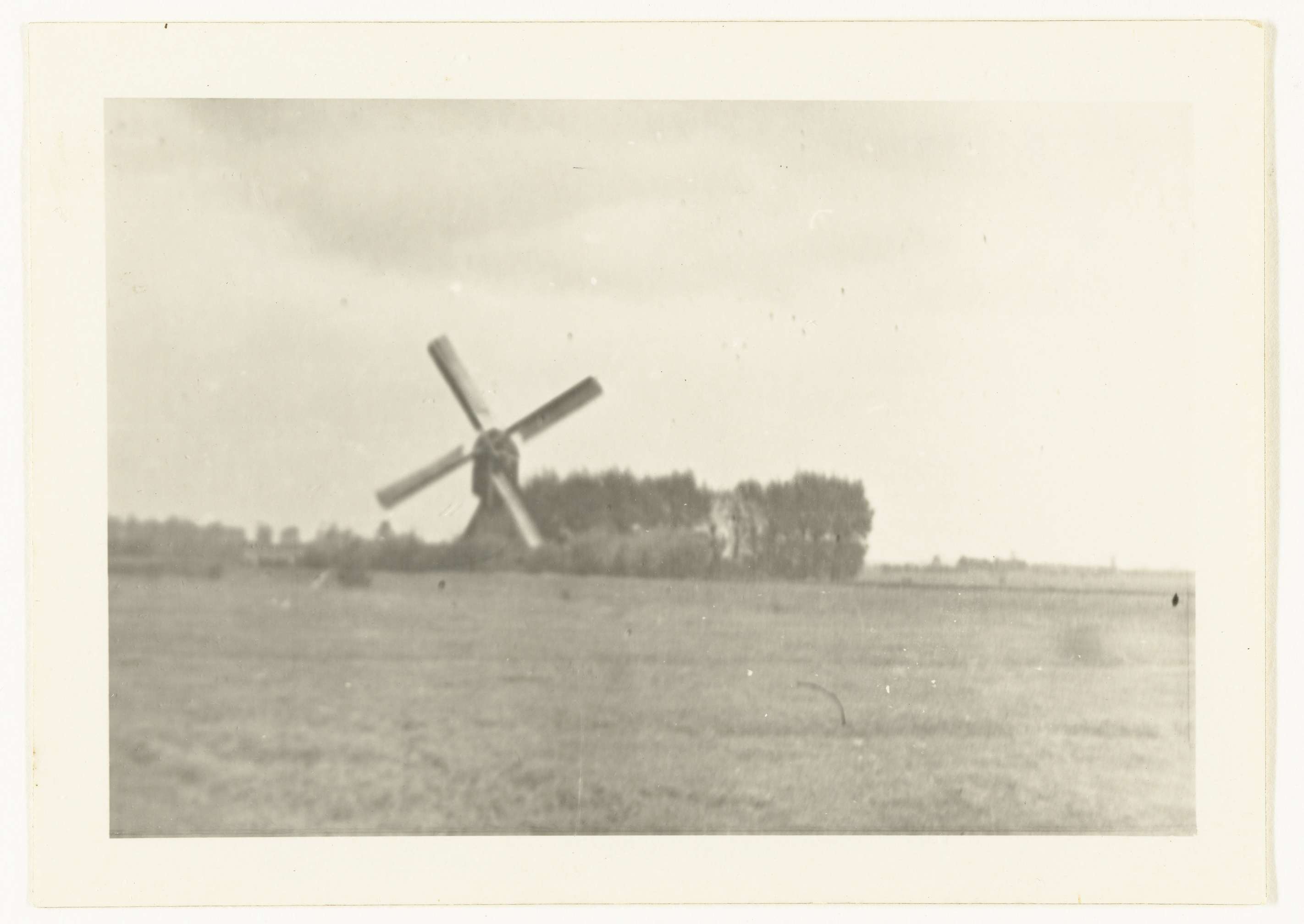Molen in een weiland. Rechts van de molen staan bomen. Tekst achterop deels onleesbaar.