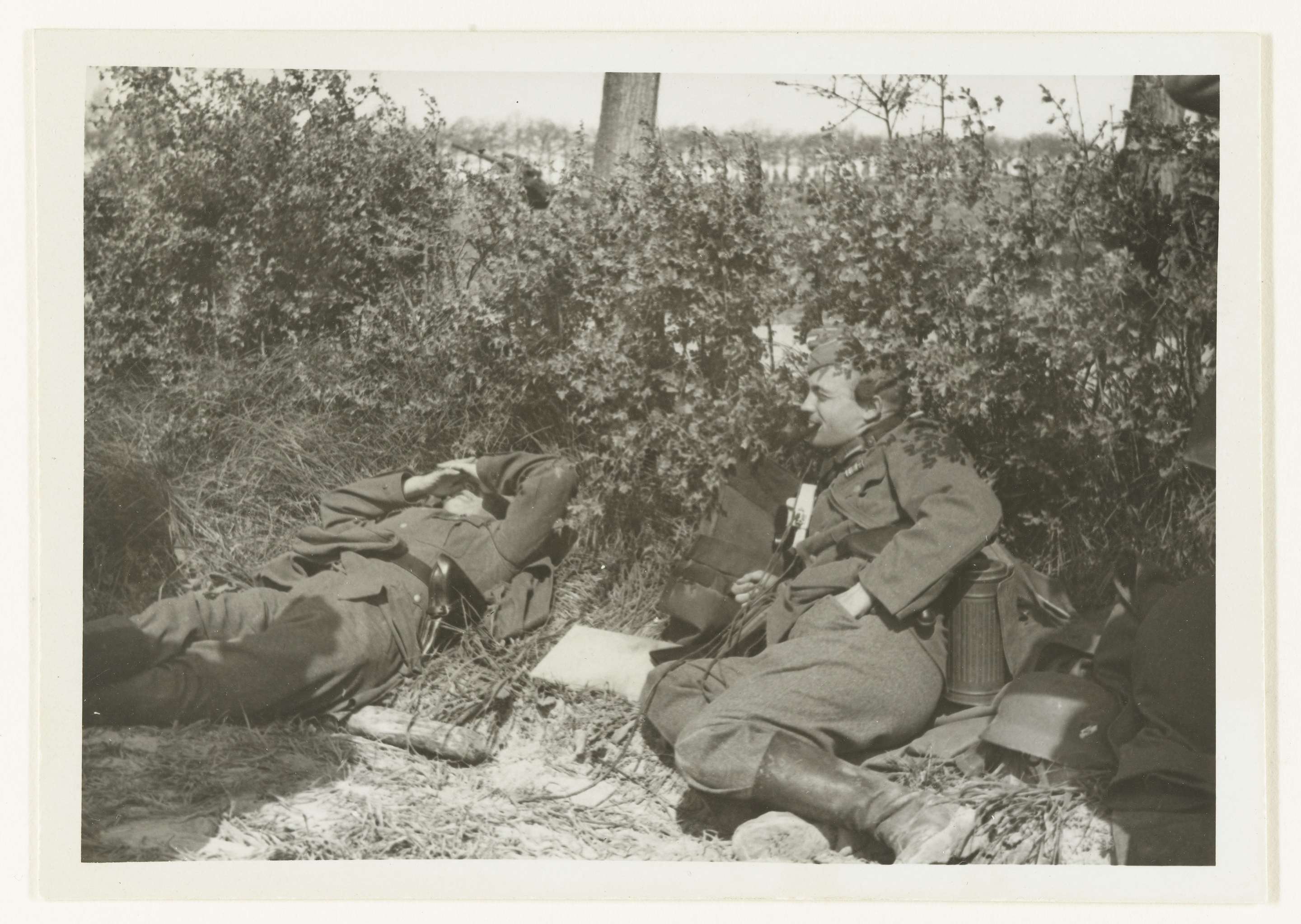 Twee Wehrmacht militairen, telegrafisten, liggen op de grond tussen wat bosjes. Een heeft een koptelefoon op.