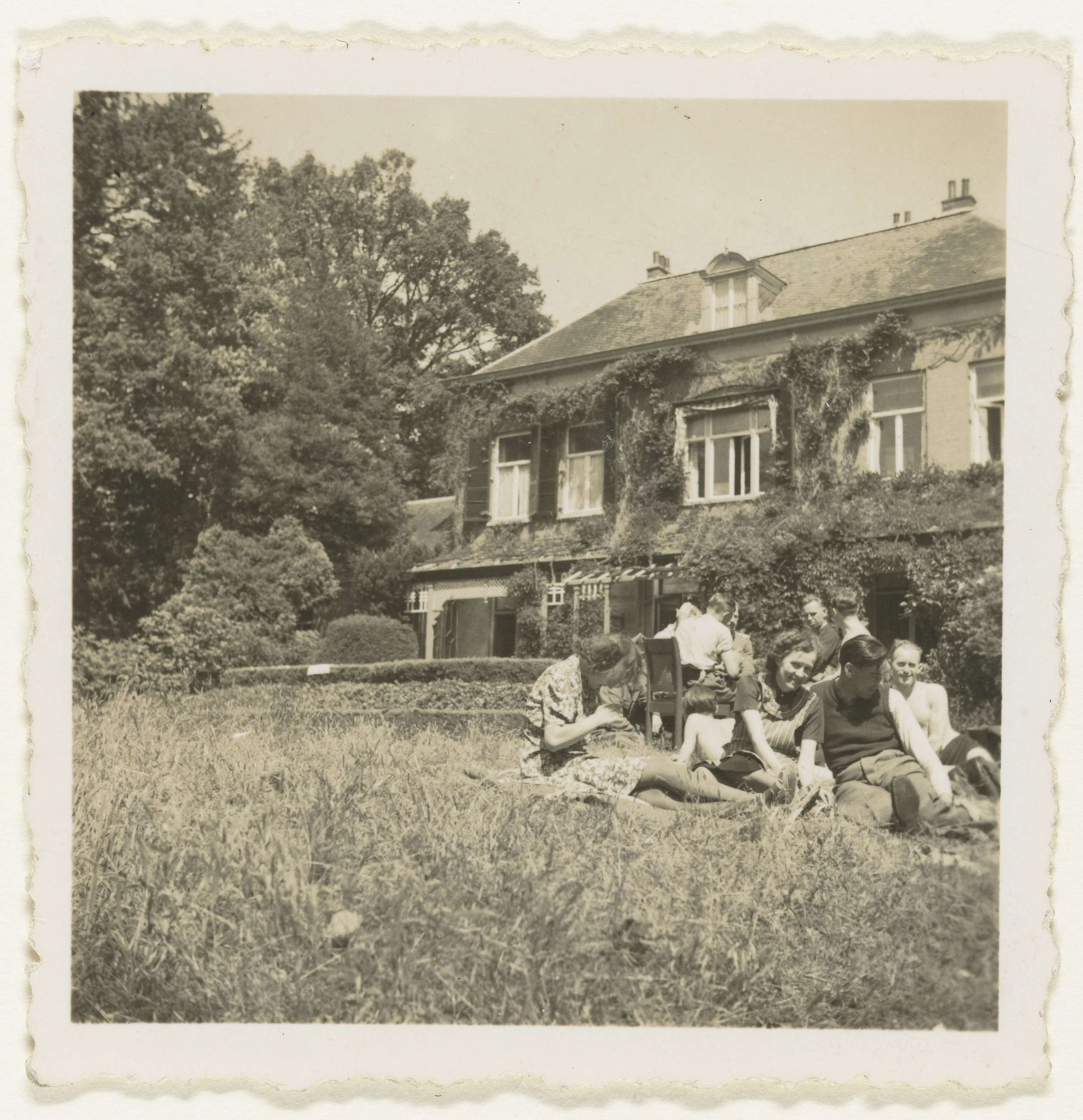 Een groep Nederlanders zitten in het gras voor een villa, achter hen aan een tafel zitten Duitse militairen