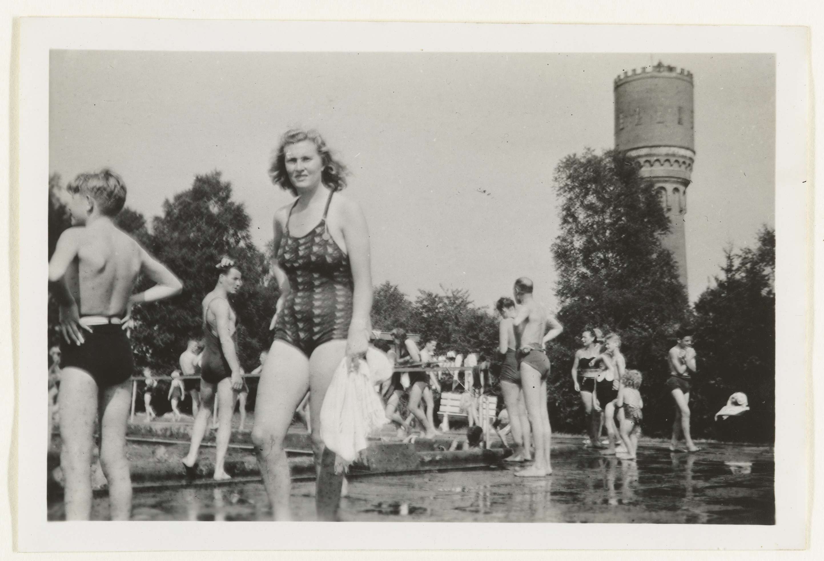 Een openlucht zwembad met mensen in badpak. Achter hen een watertoren.