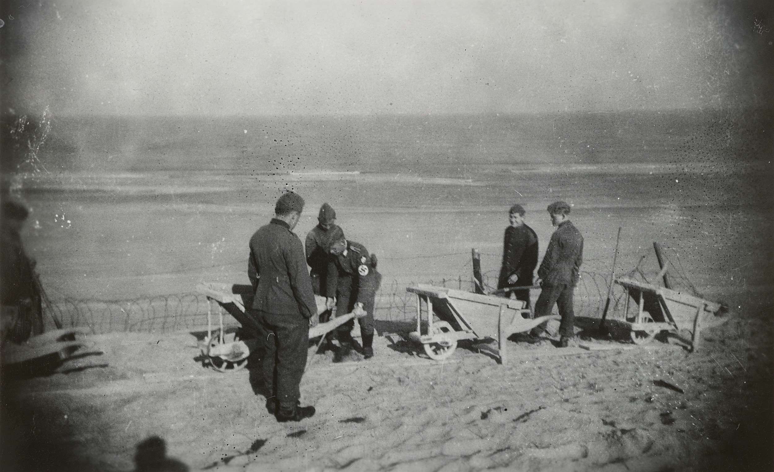 Duitse Wehrmacht militairen zijn aan het strand in de weer met kruiwagens, achter hen is een prikkeldraadversperring te zien. Een van de militairen draagt een mouwband met hakenkruis. Vanaf 1 mei 1942 was het Nederlanders verboden het strand te betreden.