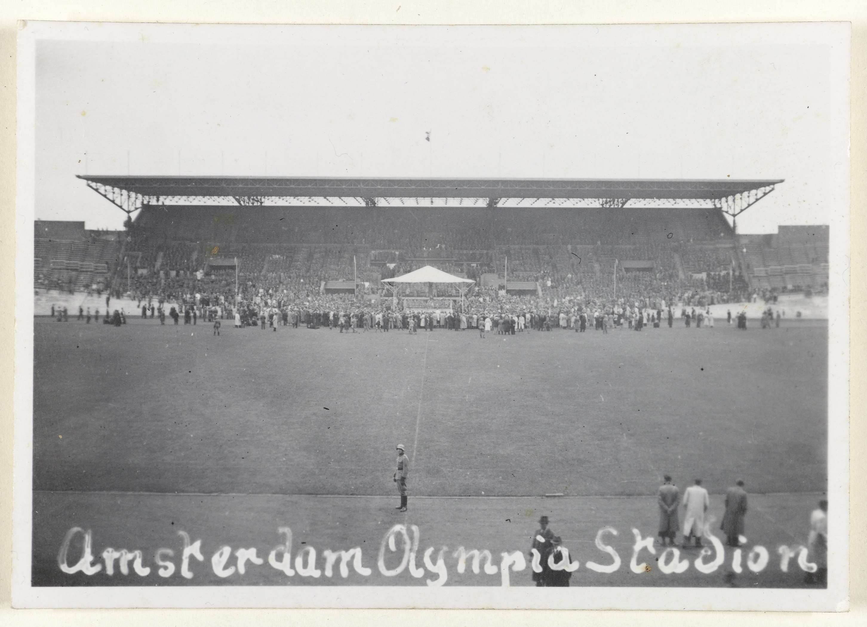 Amateurfoto van Duitse soldaten uit 1941 in het Olympisch Stadion. Voor de tribune staat een tent, daaromheen grote groep mensen.