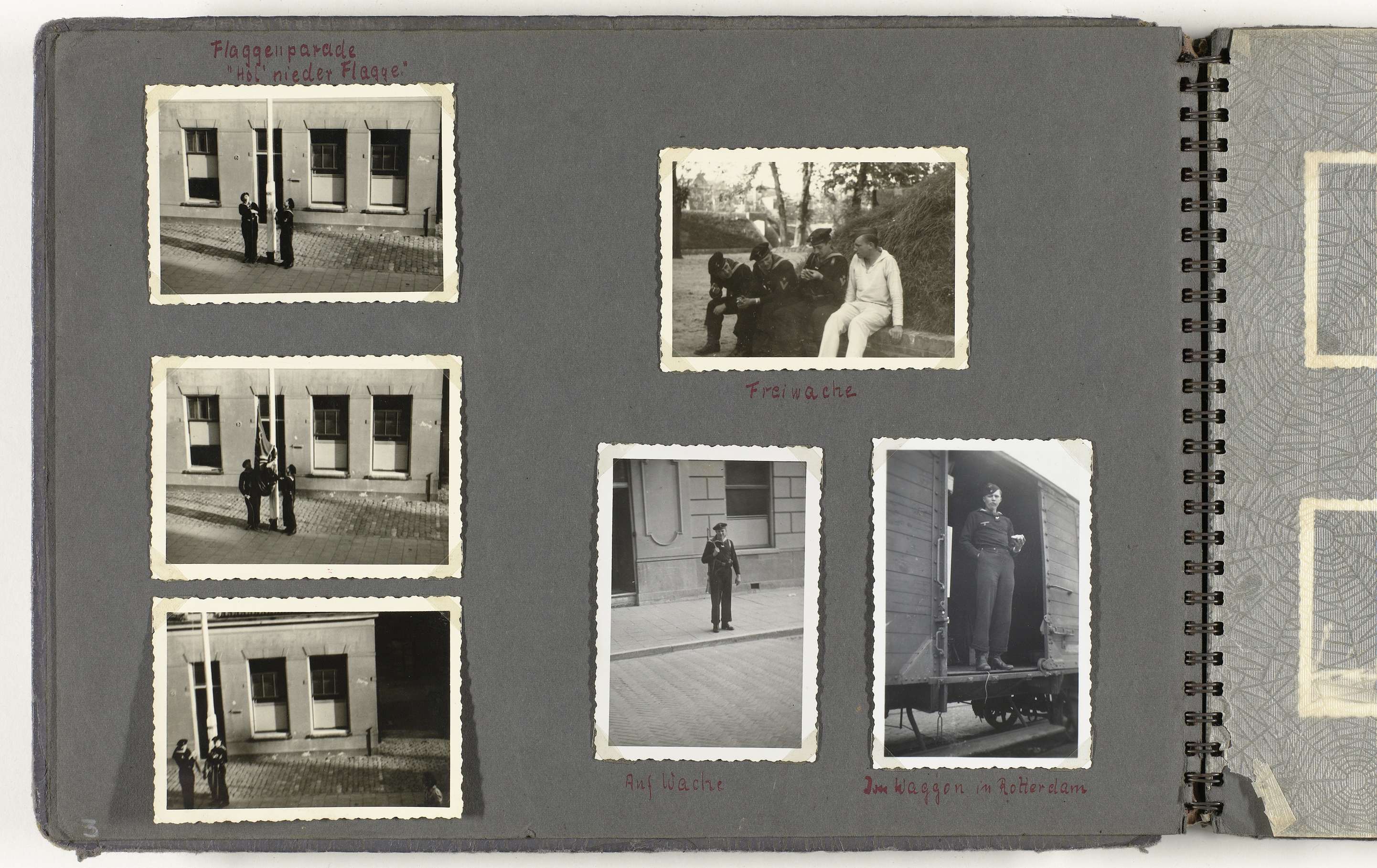 Albumblad met zes foto's. Het neerhalen van de Nederlandse vlag en hijsen van de hakenkruisvlag. Rechtsonder twee foto's van de samensteller van het album: op wacht en in de deur van een treinwagon in Rotterdam. Onderdeel van het fotoalbum van Heinrich Clausen over de Kriegsmarine.