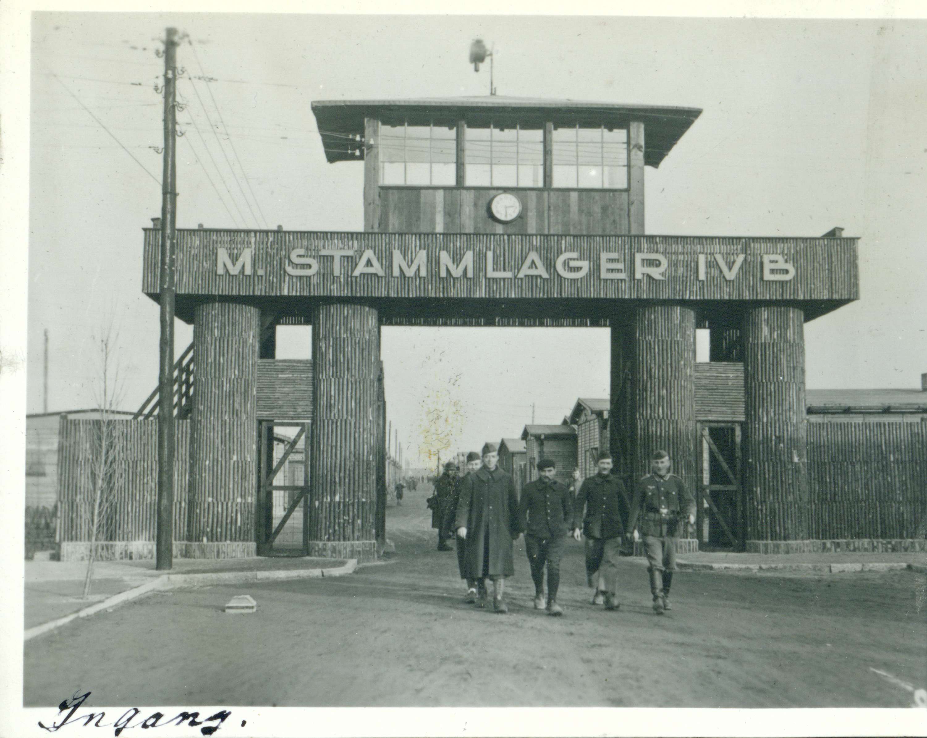 De ingang van Kamp Mühlberg, M. Stammlager IV B. Een groep gevangenen loopt met een Duitse soldaat de poort uit. Onderdeel van een fotoalbum met foto's door Dick van Maarseveen van het krijgsgevangenenkamp Stalag IV B in Mühlberg in de periode 1943-1945.