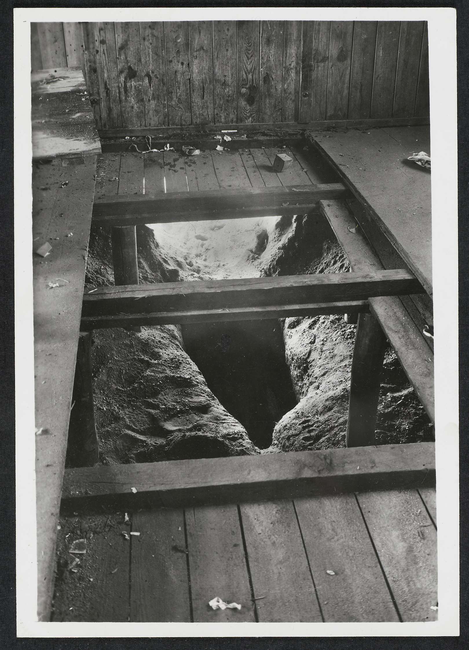 Een ontsnappingsroute uit krijgsgevangenenkamp Mühlberg die werd ontdekt door de Duitsers. Tunnel onder de vloer van een barak gegraven. Onderdeel van een groep van 130 foto's gemaakt door Dick van Maarseveen in het Duitse krijgsgevangenenkamp Stalag IV B in Mühlberg in de periode 1943-1945.