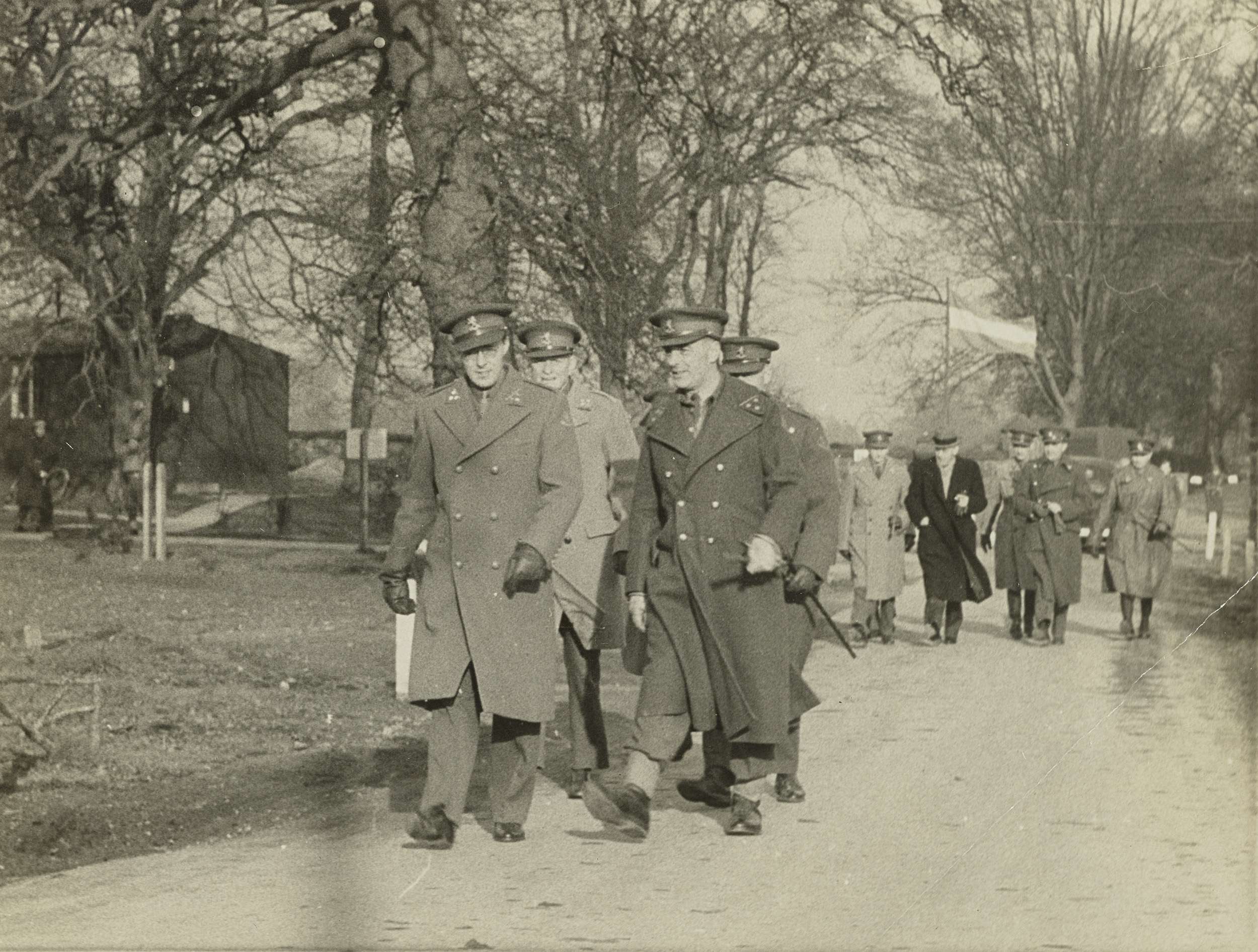 Prins Bernhard en een aantal Nederlandse militairen lopen op een weg in een landelijke omgeving.