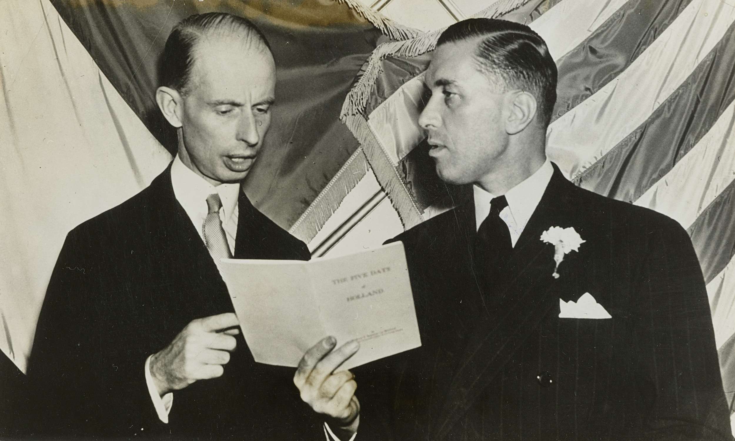 Eelco Nicolaas van Kleffens (1894-1983) was tijdens de Tweede Wereldoorlog de Nederlandse minister van buitenlandse zaken in Londen. Op de foto staat hij links. De foto is gemaakt tijdens het bezoek wat hij op 13 juni 1941 bracht aan Dr. N.A.C. Slotemaker de Bruine in de Verenigde Staten. De heer Slotemaker de Bruine was de directeur van het Netherlands Information Bureau te New York. Van Kleffens werd in 1939 Minister van Buitenlandse Zaken in het kabinet-De Geer II. Hij zette de toenmalige Nederlandse neutraliteitspolitiek voort. Op 10 mei 1940 ontving Van Kleffens een verklaring voor de Duitse aanval op Nederland van de Duitse gezant Graf Zech von Burkensroda. Hiermee was een einde gekomen aan de neutraliteit. Om steun te zoeken bij de geallieerden, vertrok Van Kleffens diezelfde ochtend met minister Charles Welter van Koloniën naar Londen. De rest van het kabinet zou later volgen. Tijdens de periode van de Nederlandse regering in Londen bleef Van Kleffens zijn ministerspost vervullen. Tijdens het kabinet-Gerbrandy II werd een tweede minister van buitenlandse zaken naast Van Kleffens benoemd. Met zijn diplomatieke kwaliteiten kon Van Kleffens vaak bemiddelen in conflicten tussen koningin Wilhelmina en minister-president Gerbrandy. In 1943 kwam hij met ideeën voor de oprichting van een Europese staat. In een radiotoespraak op 28 december 1943 pleitte hij voor het oprichten van een atlantisch bondgenootschap, de latere NAVO. Ook heeft hij aan de wieg gestaan van de Benelux. Deze foto is afkomstig uit de nalatenschap van kunstenaar Cor Visser.
