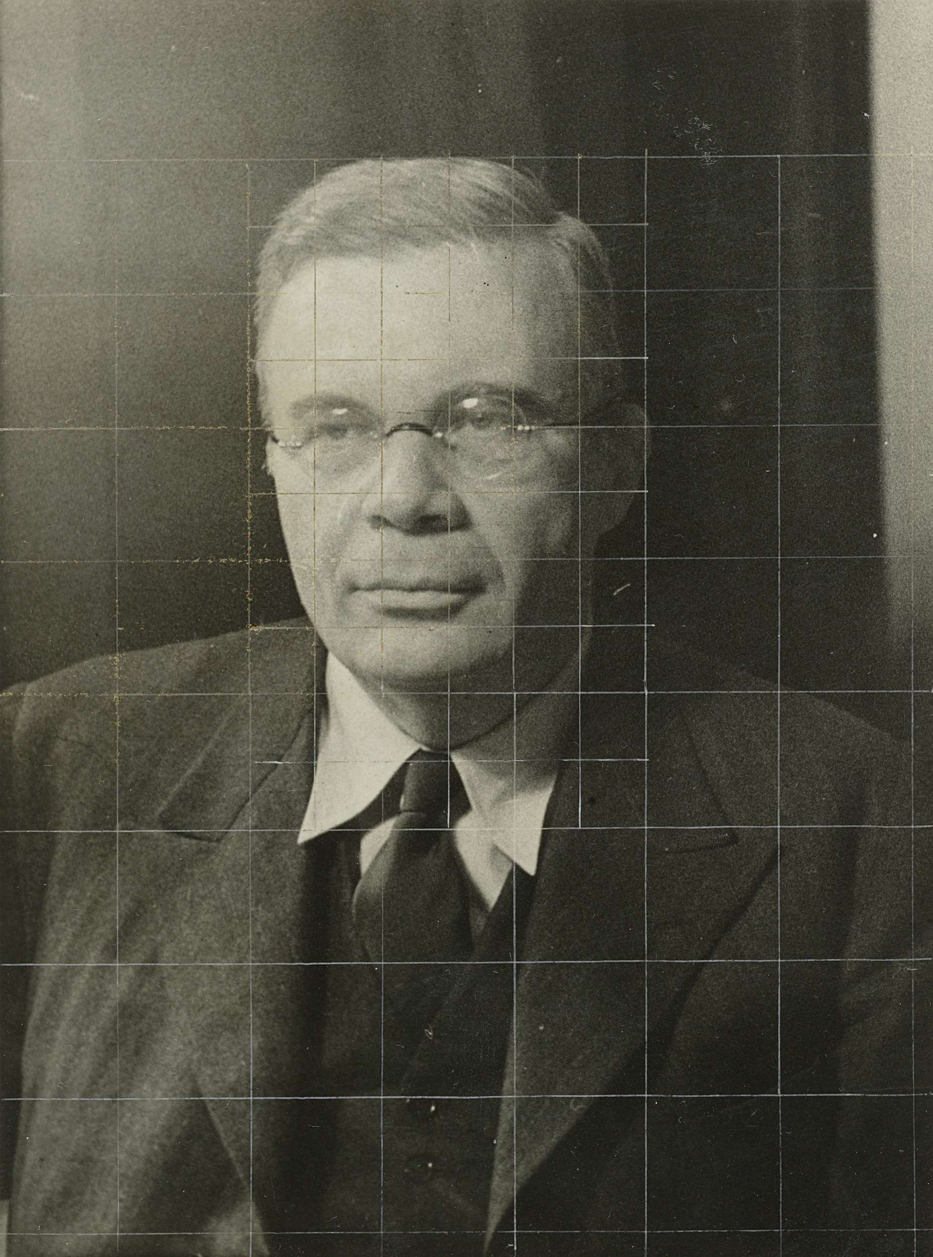 Portret van Hubertus Johannes van Mook (1894-1965), minister van koloniën. Na de Japanse inval vluchtte Van Mook uit Nederlands-Indië naar Australië en ging van daar naar Londen. In Londen werd hij de Nederlandse minister van Koloniën. Het lijnennet op de foto is aangebracht door kunstenaar Cor Visser. Op de achterkant van de foto staan aantekeningen met potlood.