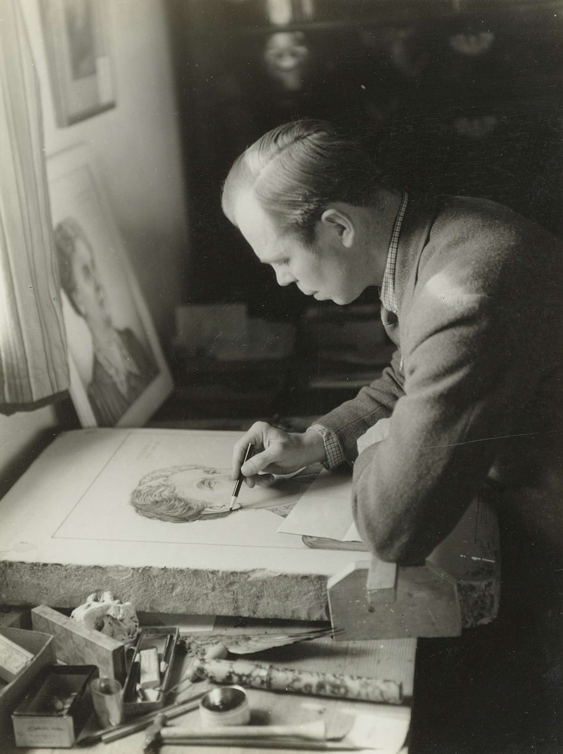 Kunstenaar Cor Visser bezig met het lithograferen van het portret van koningin Wilhelmina. Visser woonde tijdens de oorlog in Frenkenham (Suffolk). De foto is in zijn huis genomen.Op de grond staat een portret van koning Wilhelmina.