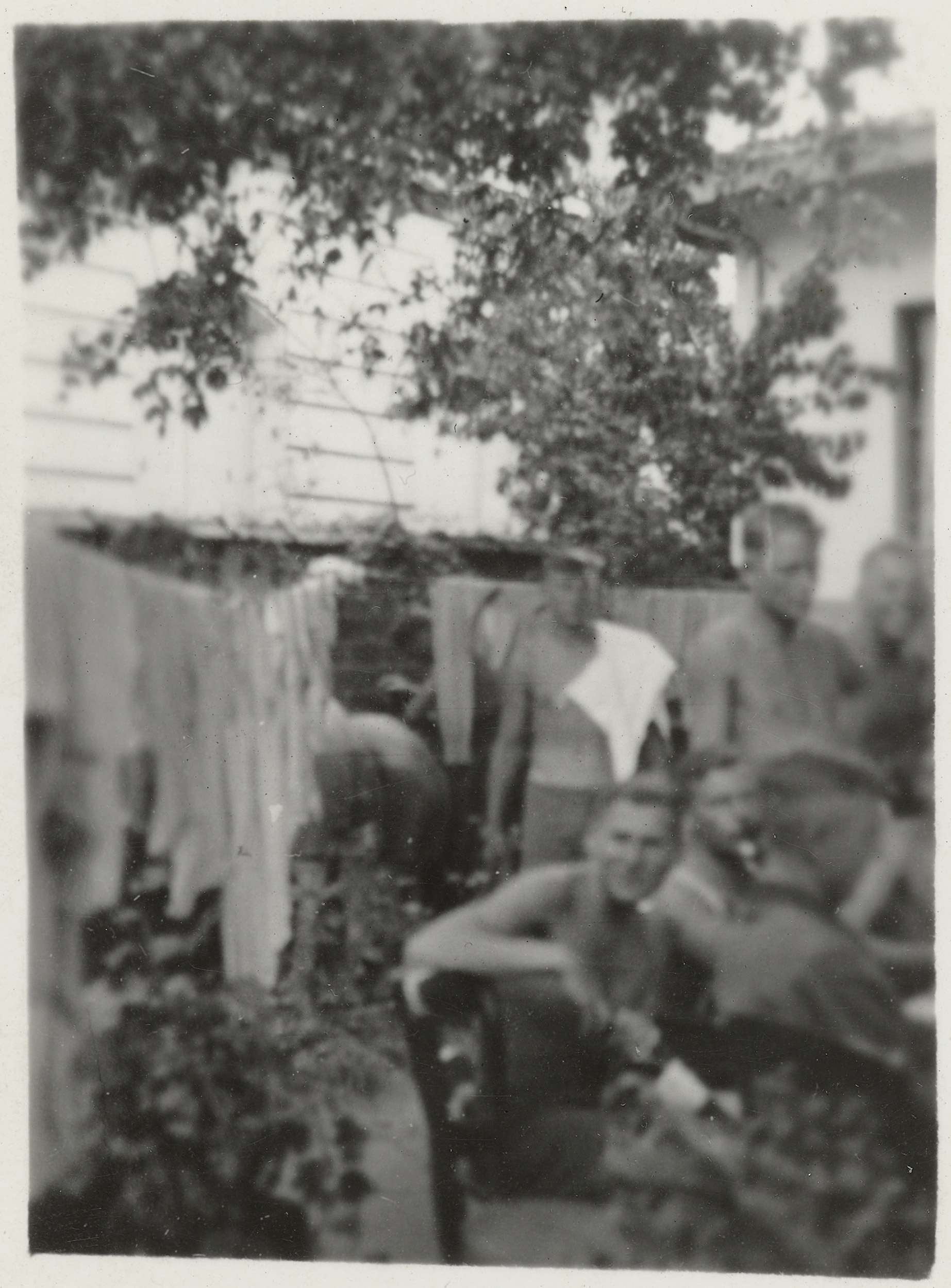 Een groep soldaten in een tuin. Achter hen hangt wasgoed. Foto behorend bij album 'Kriegserinnerungen'.