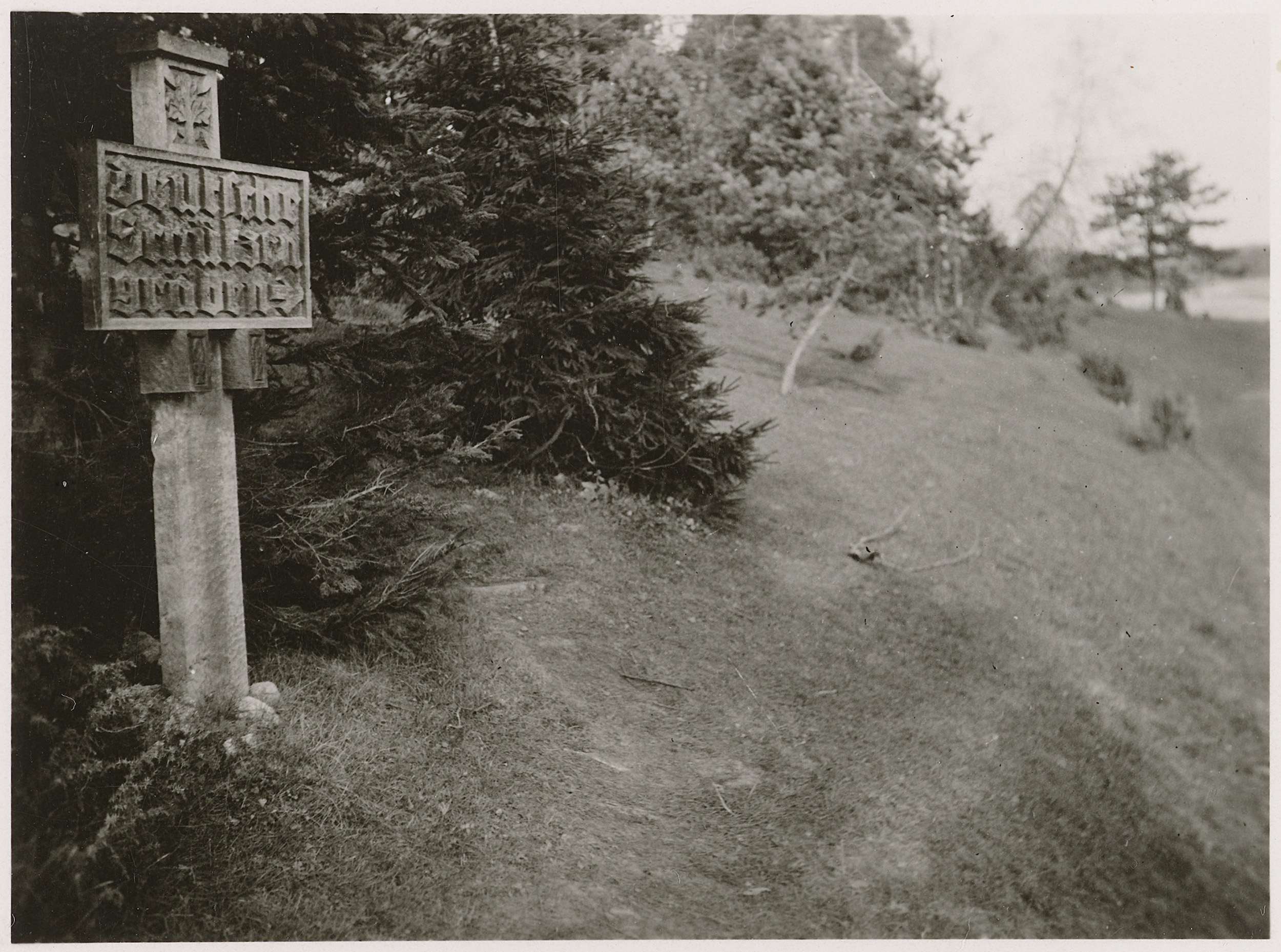 Een monument langs de weg. Het opschrift kan zijn: Zutritt Strassen Graben. Foto behorend bij album 'Kriegserinnerungen'.