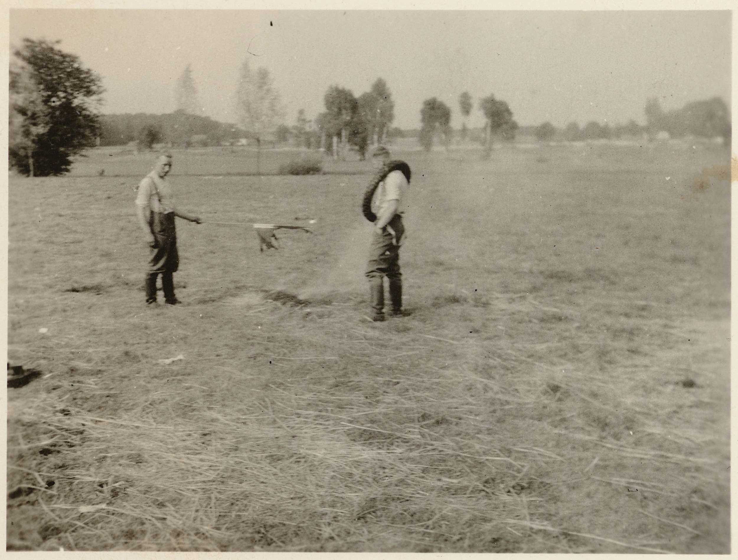 Twee soldaten in een weiland, een heeft een soort krans om zijn nek. Foto behorend bij album 'Kriegserinnerungen'.