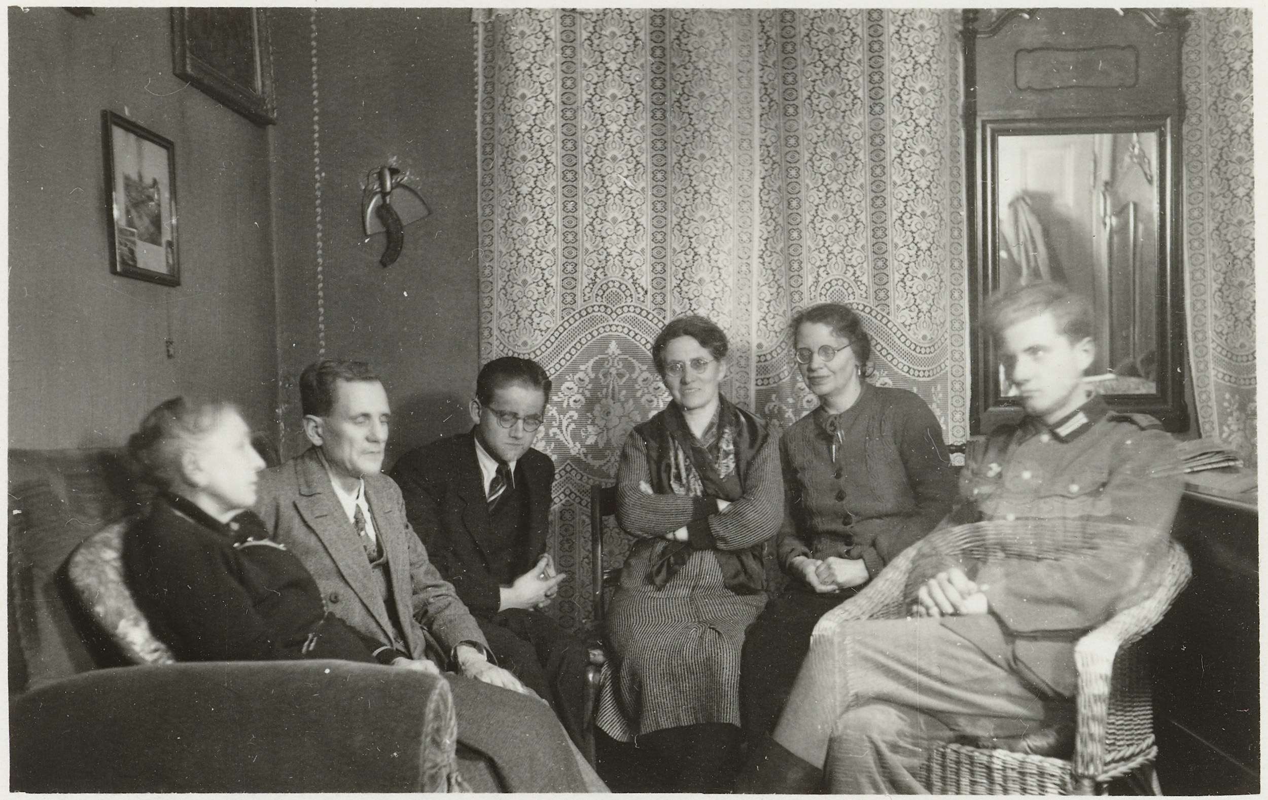 Zeven personen zitten bij elkaar in een kamer, een van hen is in uniform. Achterop staat 1939. Foto behorend bij album 'Kriegserinnerungen'.
