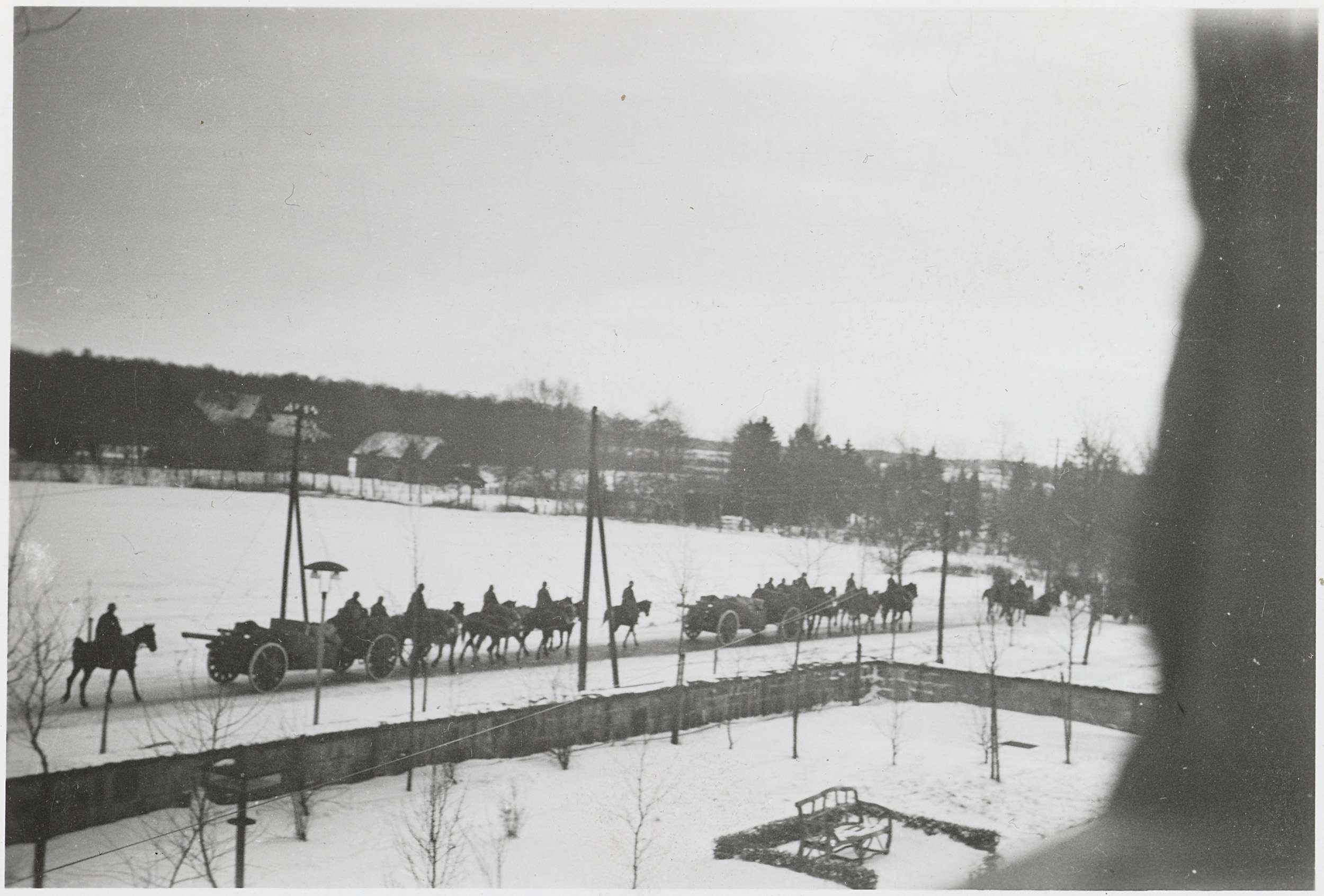 Door een besneeuwd landschap trekken soldaten op paarden en met karren met kanonnen erachter. Foto behorend bij album 'Kriegserinnerungen'.