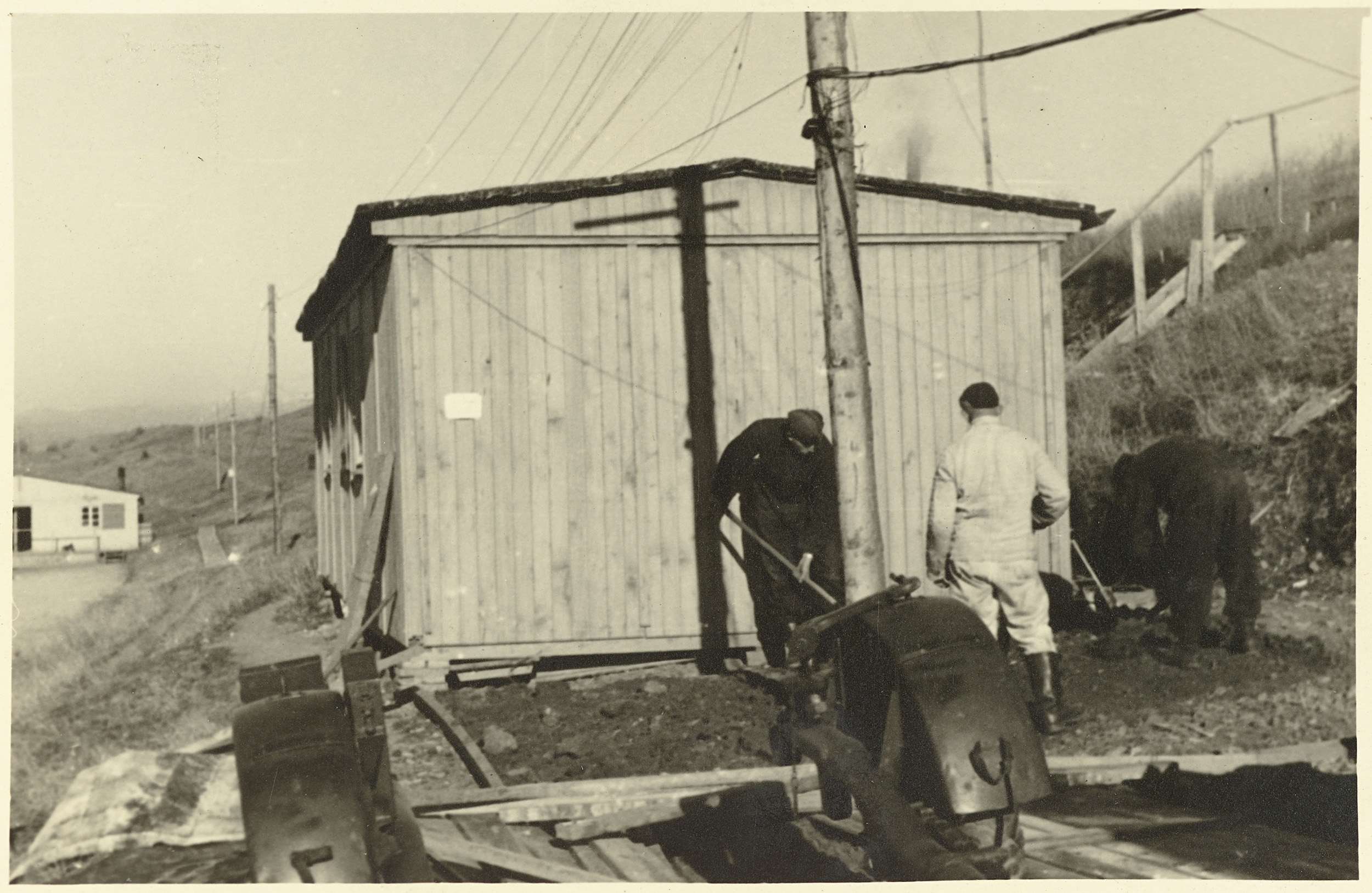 Drie Wehrmachtsoldaten bij een houten barak
