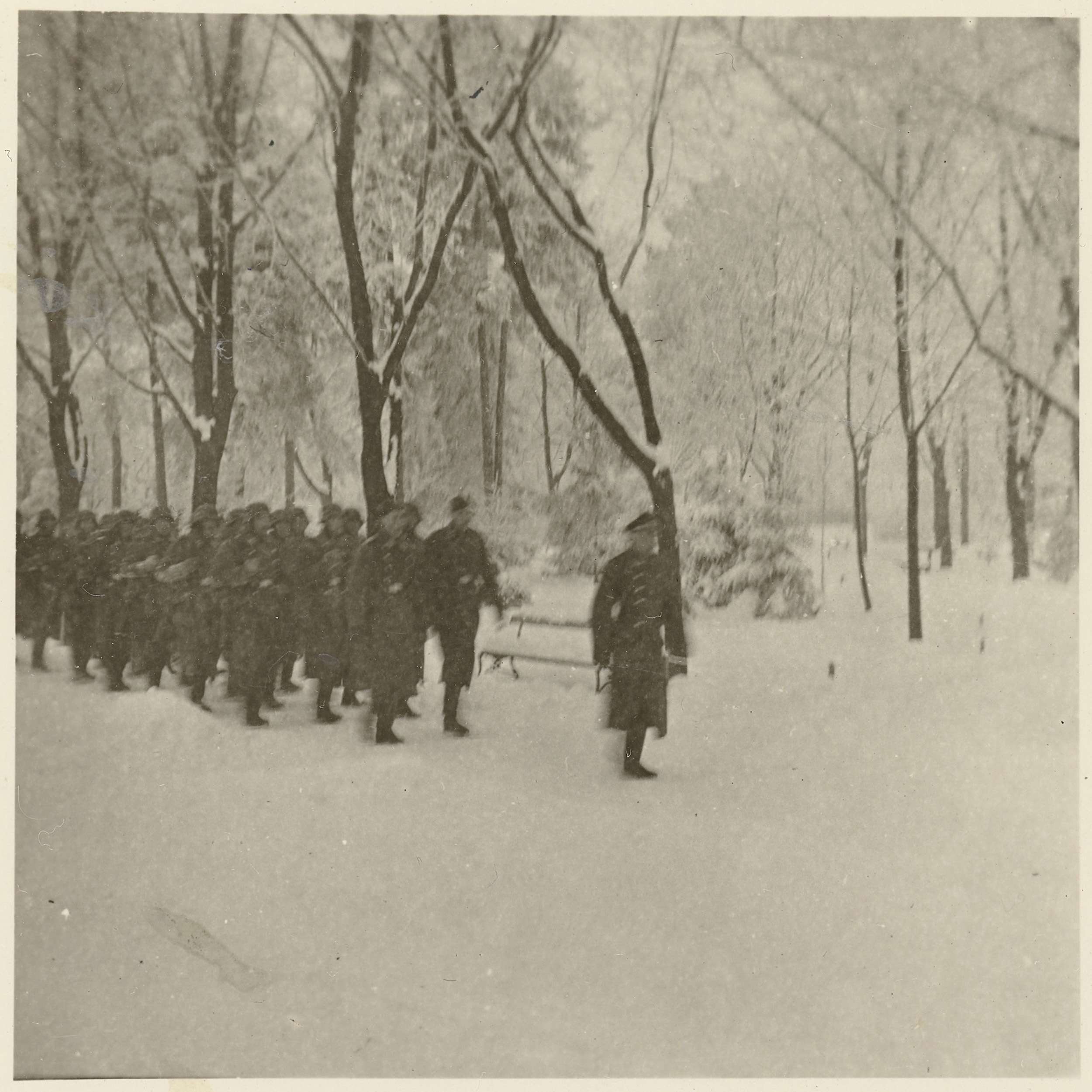 Een groep Wehrmachtsoldaten loopt door een besneeuwd bos. Foto behorend bij album 'Kriegserinnerungen'.