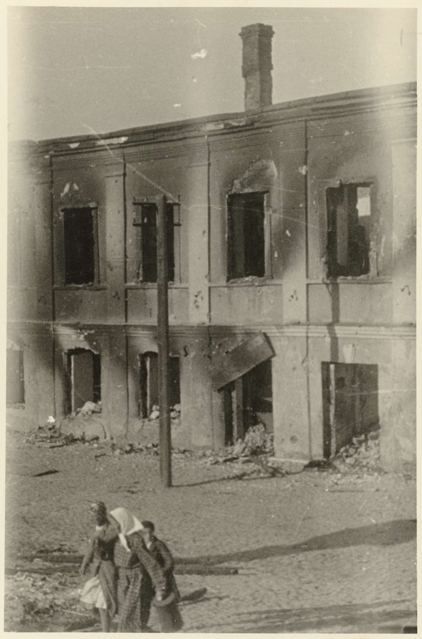 Twee vrouwen, een met wit hoofddoekje, lopen over straat voor een verbrand gebouw. Foto behorend bij album 'Kriegserinnerungen'.