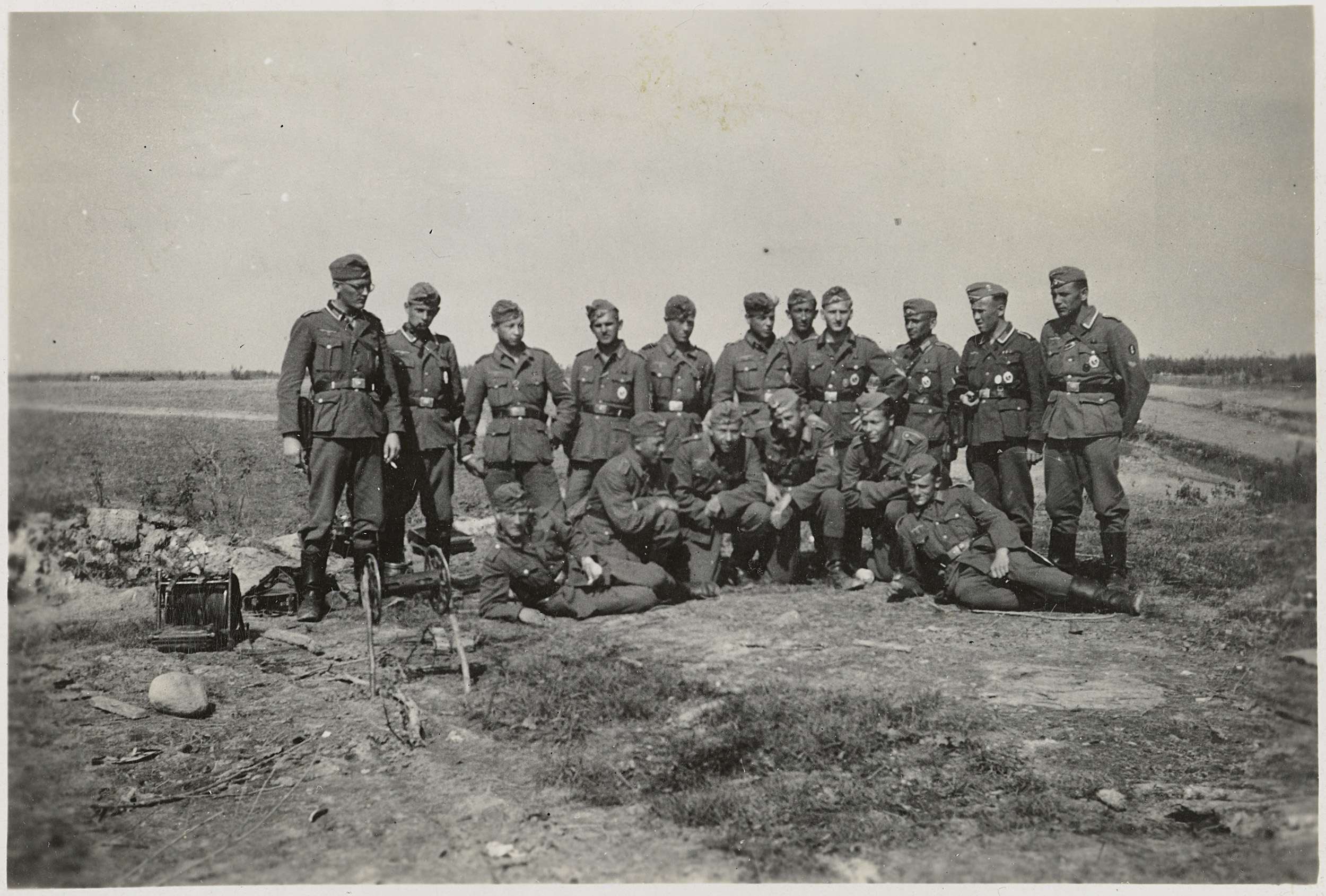 Groep militairen, staand en liggend, in een heuvelachtig terrein. Opschrift: Die Nachrichtenstaffel an der Pola. August '42. Foto behorend bij album 'Kriegserinnerungen'.