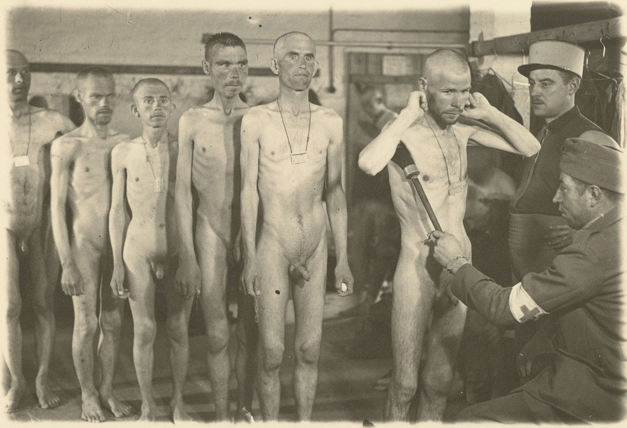 Ontluizing van staande naakte (vermoedelijk) Russische krijgsgevangenen in Mühlberg. Onderdeel van een groep foto's gemaakt door Dick van Maarseveen in het Duitse krijgsgevangenenkamp Stalag IV B in Mühlberg in de periode 1943-1945.