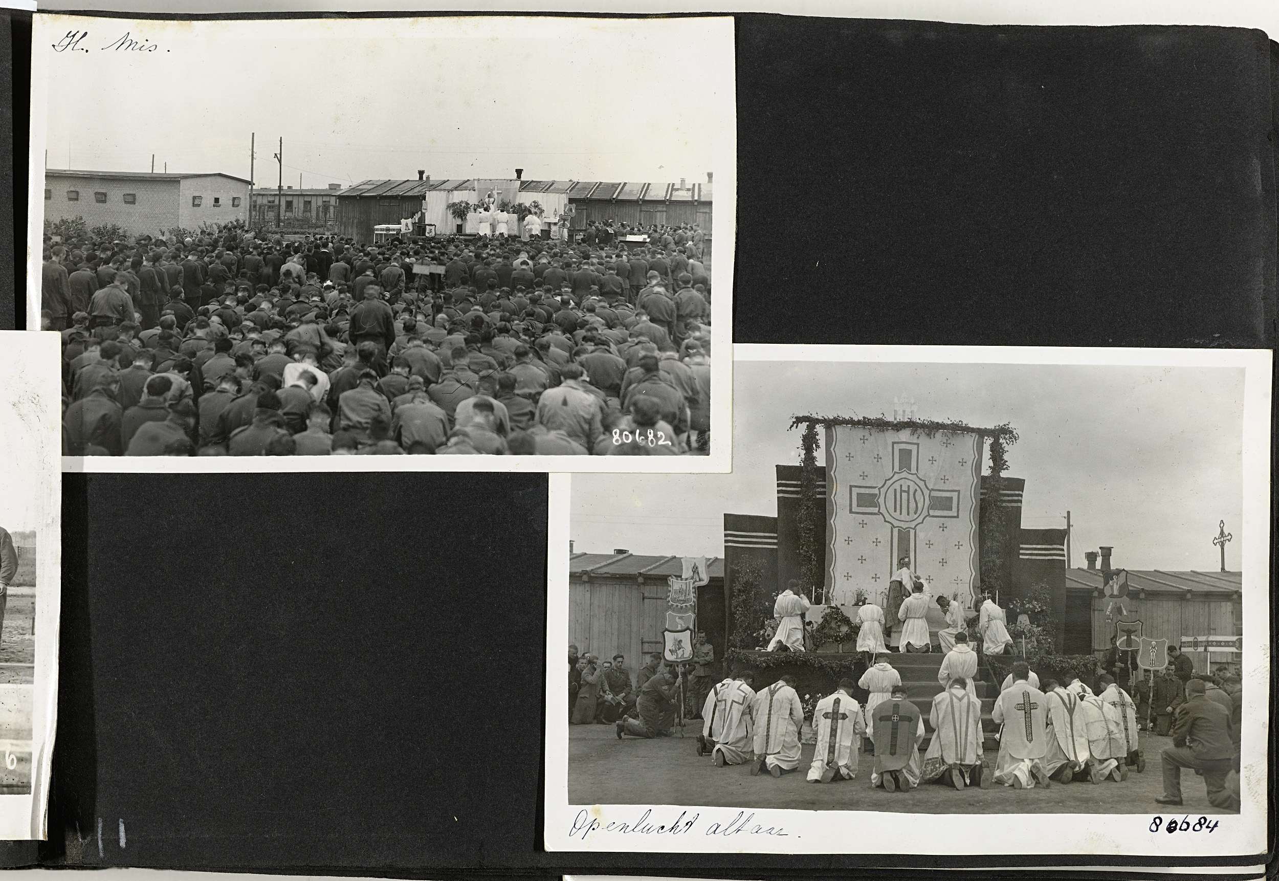 Albumblad met twee foto's: een mis gehouden in open lucht. Onderdeel van een fotoalbum met foto's door Dick van Maarseveen van het krijgsgevangenenkamp Stalag IV B in Mühlberg in de periode 1943-1945.