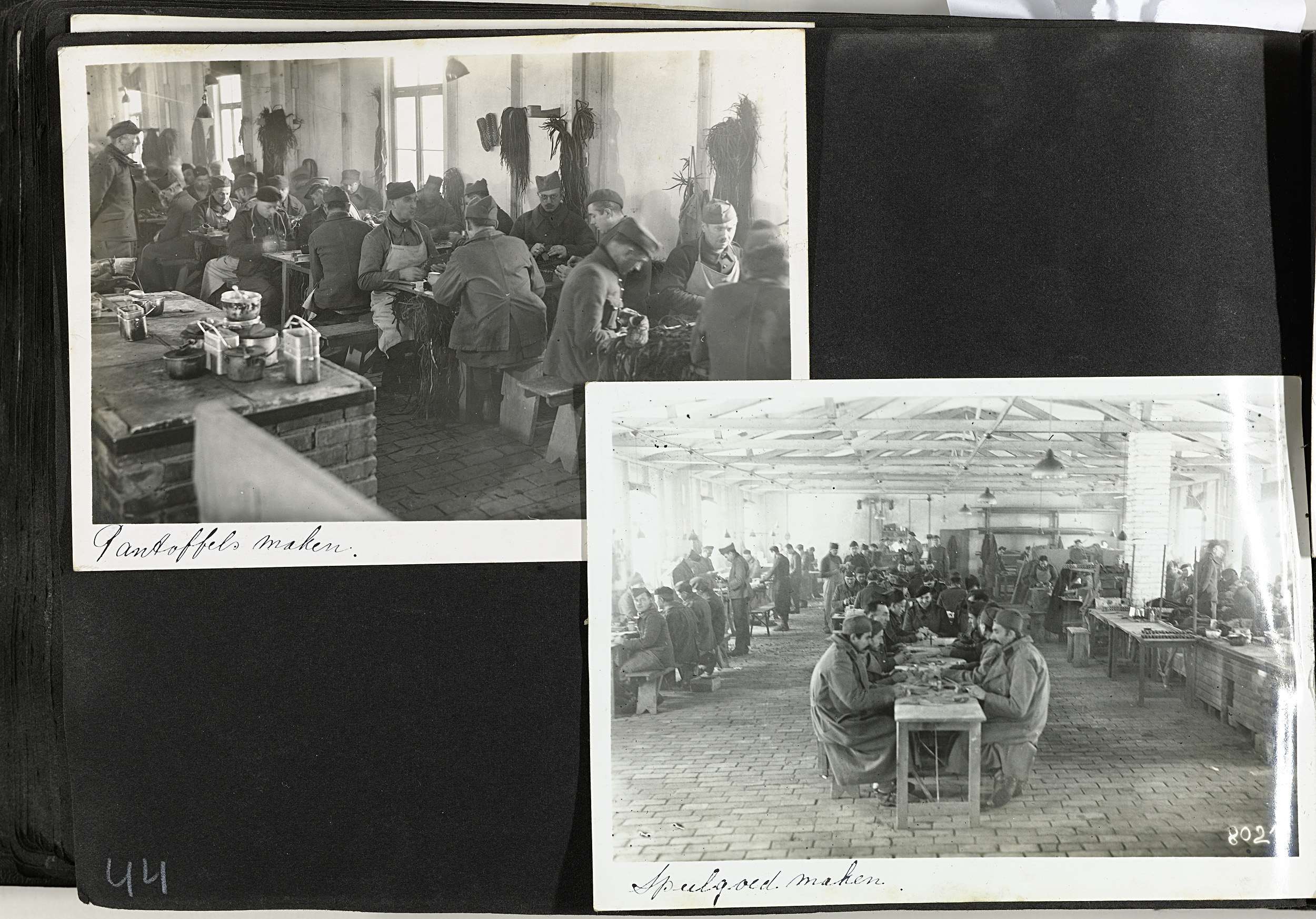 Albumblad met twee foto's: een werkplaats waar pantoffels gemaakt worden en een werkplaats waar men speelgoed maakt. Onderdeel van een fotoalbum met foto's door Dick van Maarseveen van het krijgsgevangenenkamp Stalag IV B in Mühlberg in de periode 1943-1945.
