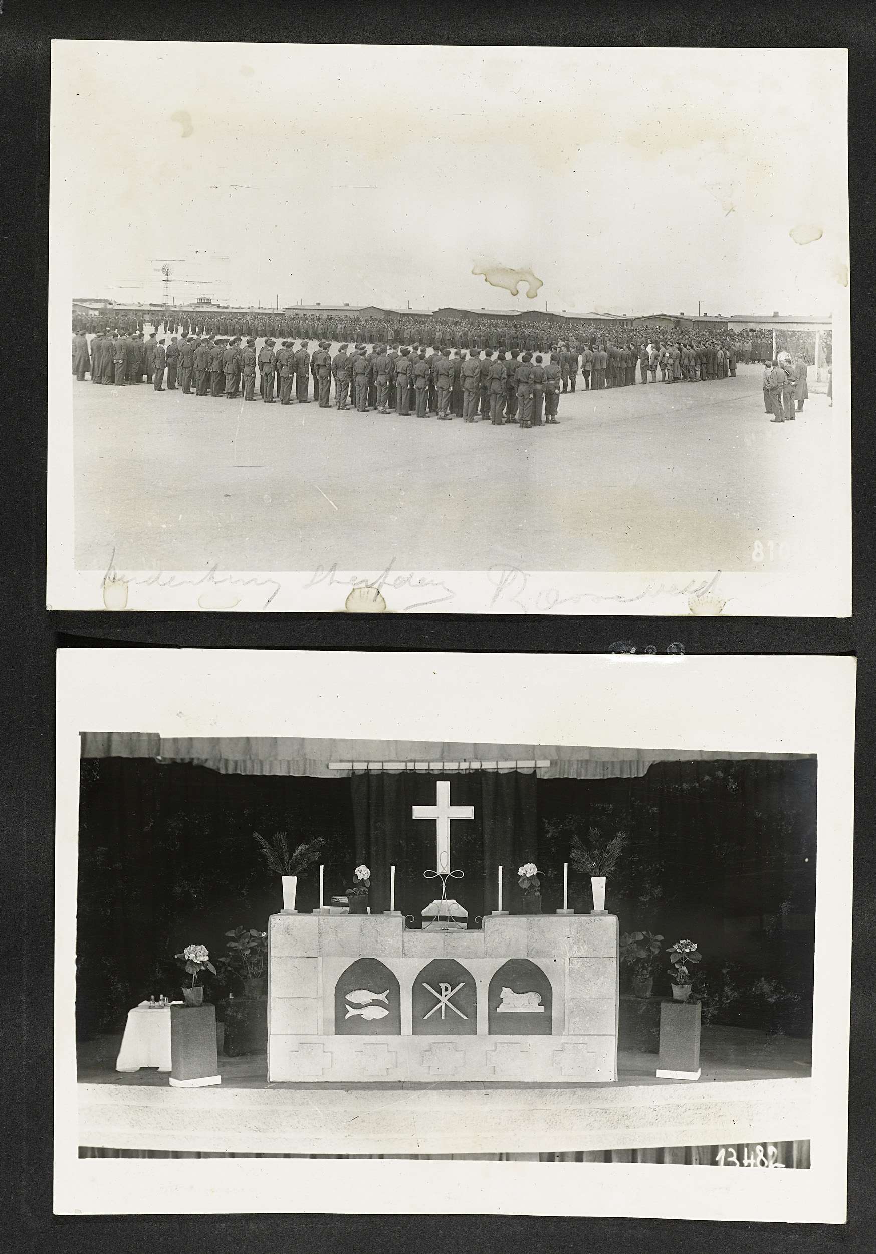 Albumblad met twee foto's: bijeenkomst van alle gevangenen bij het overlijden van de Amerikaanse president Roosevelt op 12 april 1945 en een altaar voor de mis. Onderdeel van een fotoalbum met foto's door Dick van Maarseveen van het krijgsgevangenenkamp Stalag IV B in Mühlberg in de periode 1943-1945.