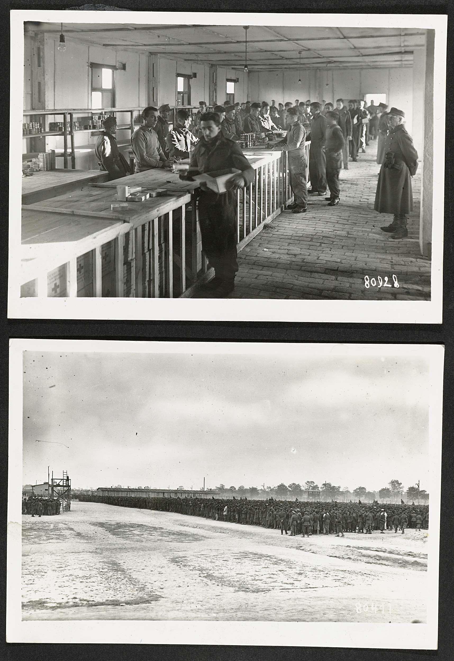 Albumblad met twee foto's: krijgsgevangenen in de kampwinkel en de appelplaats met honderden krijgsgevangenen. Onderdeel van een fotoalbum met foto's door Dick van Maarseveen van het krijgsgevangenenkamp Stalag IV B in Mühlberg in de periode 1943-1945.