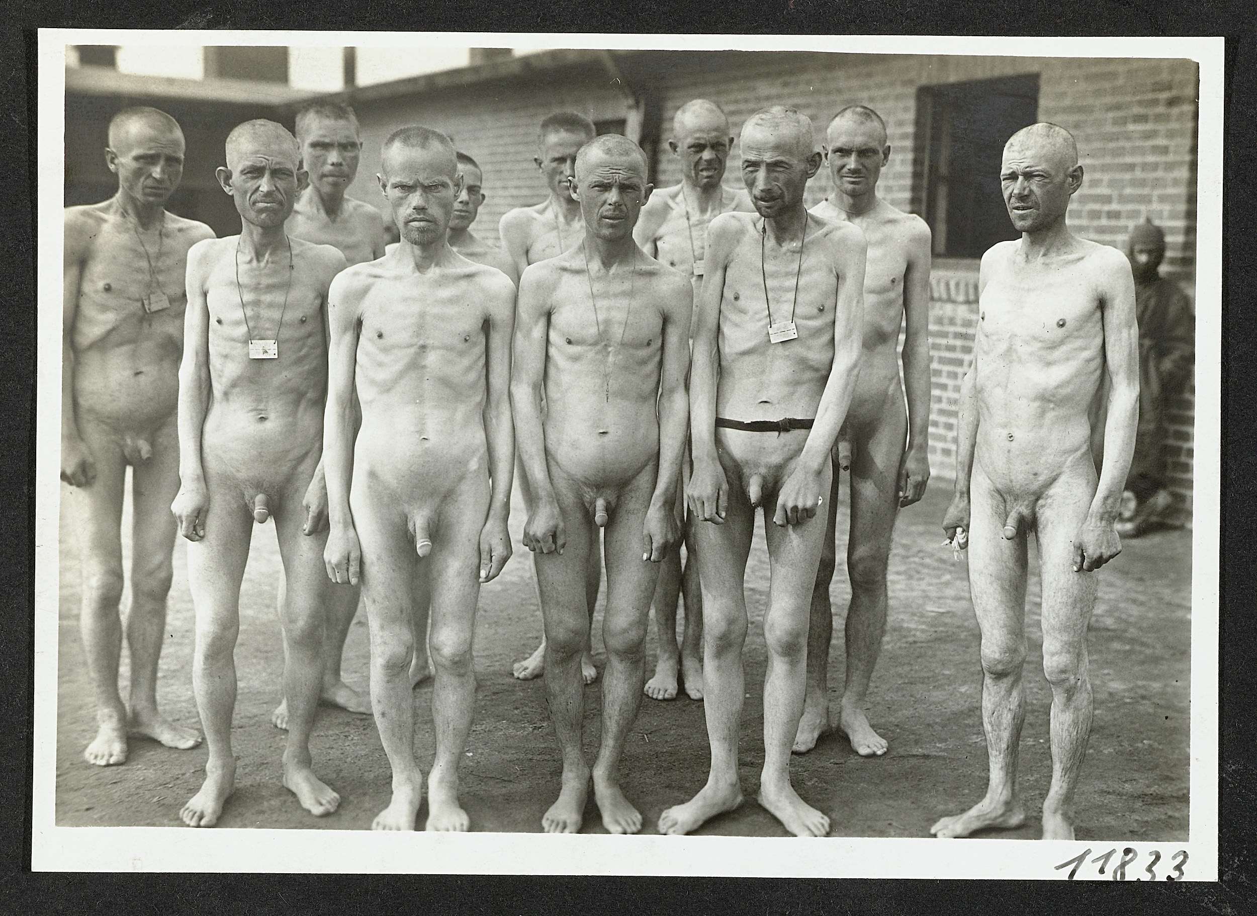 Albumblad met één foto: een groep van elf staande naakte, sterk vermagerde krijgsgevangenen. Onderdeel van een fotoalbum met foto's door Dick van Maarseveen van het krijgsgevangenenkamp Stalag IV B in Mühlberg in de periode 1943-1945.