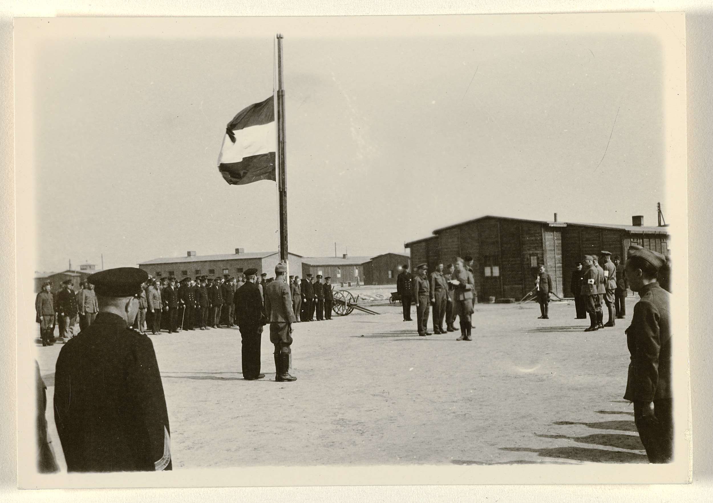 Het laatste appel van de Nederlanders in het kamp kort na de bevrijding, 1945. De Nederlandse vlag wordt gehesen. Onderdeel van een groep foto's gemaakt door Dick van Maarseveen in het Duitse krijgsgevangenenkamp Stalag IV B in Mühlberg in de periode 1943-1945.