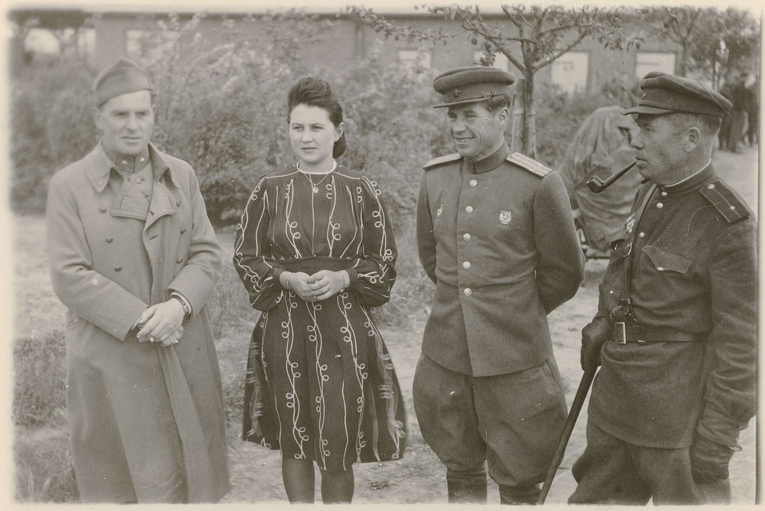 Twee Russische soldaten, een vrouwelijke Russische tolk en dominee Van Garderen. Het Russische leger bevrijdde het kamp op 23 april 1945. Onderdeel van een groep foto's gemaakt door Dick van Maarseveen in het Duitse krijgsgevangenenkamp Stalag IV B in Mühlberg in de periode 1943-1945.