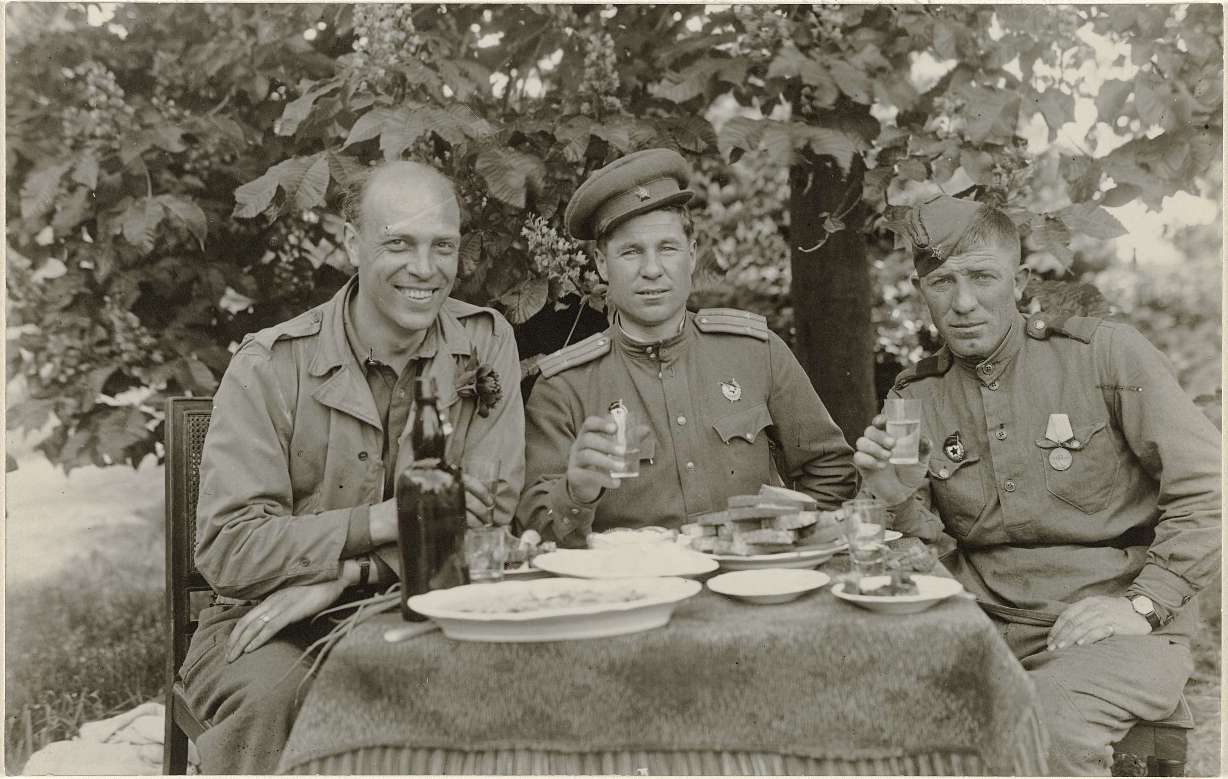 Fotograaf Van Maarseveen drinkt een glaasje met de Russische luitenant-kolonel Vladimir Zjoeralov Koezmitsj en zijn chauffeur, 17 mei 1945. Onderdeel van een groep foto's gemaakt door Dick van Maarseveen in het Duitse krijgsgevangenenkamp Stalag IV B in Mühlberg in de periode 1943-1945.