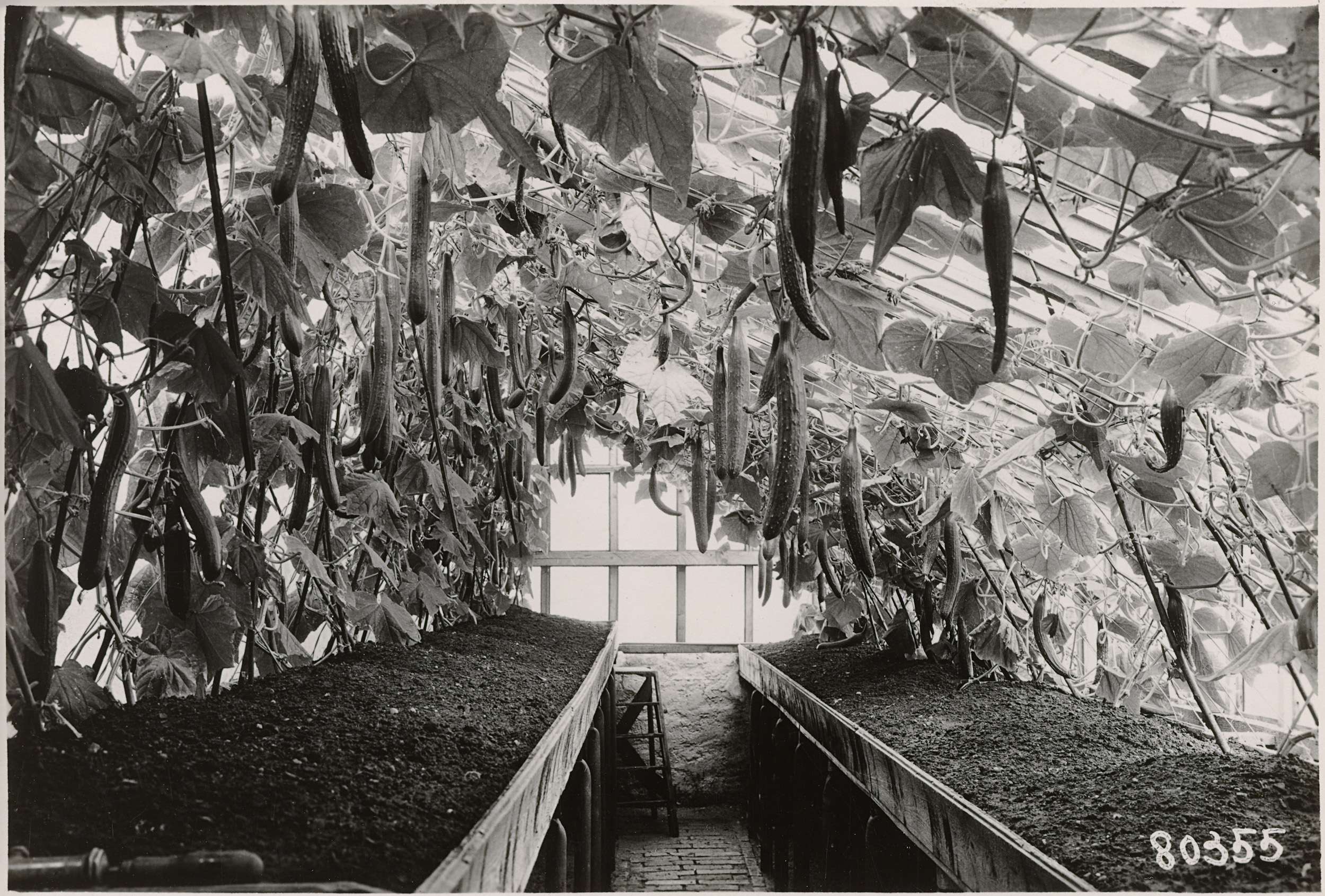 De groentekas in Kamp Mühlberg waar komkommers gekweekt worden. Onderdeel van een groep foto's gemaakt door Dick van Maarseveen in het Duitse krijgsgevangenenkamp Stalag IV B in Mühlberg in de periode 1943-1945.