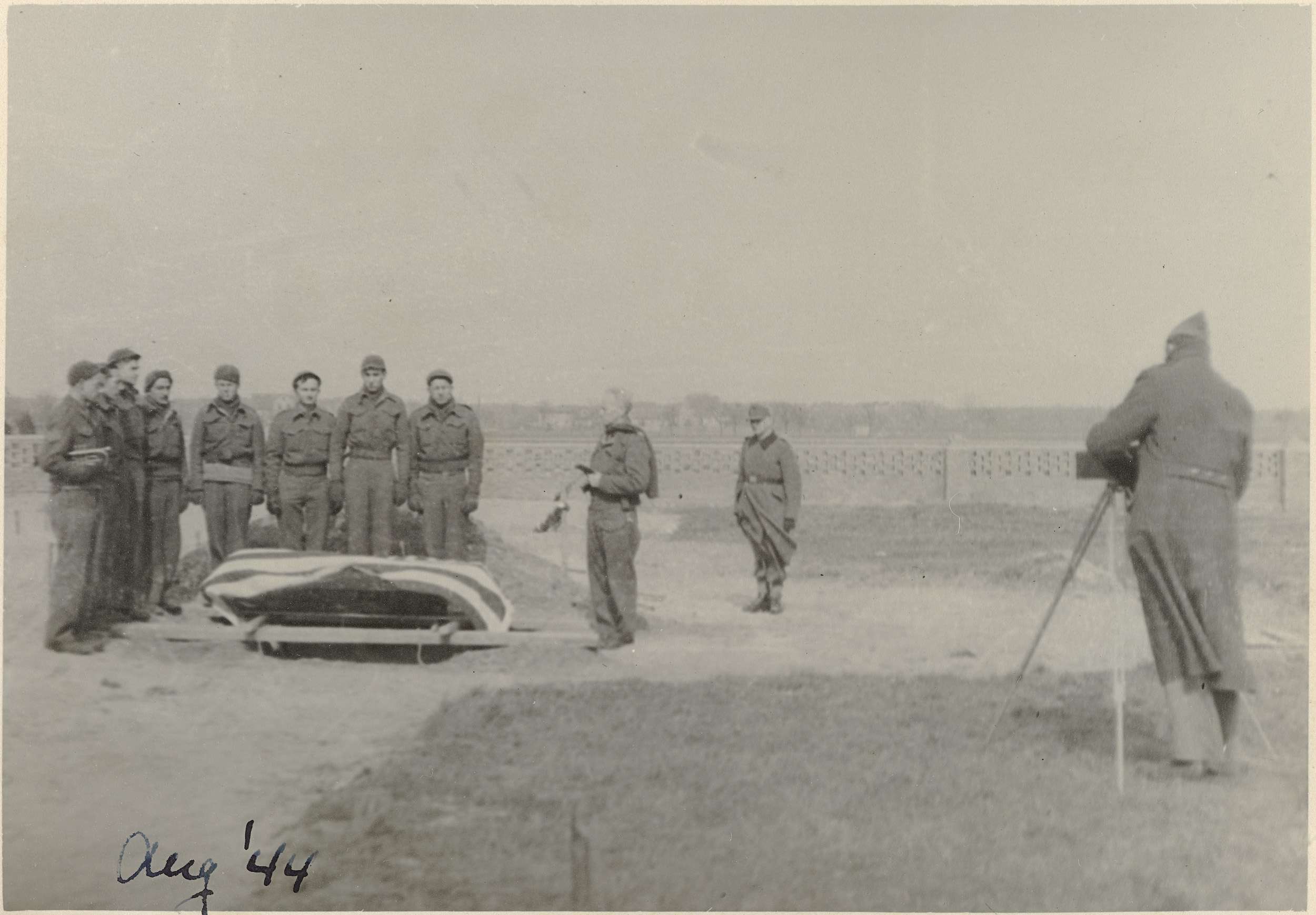 De begrafenis van een Amerikaanse krijgsgevangene op de begraafplaats in Neuburxdorf even buiten Kamp Mühlberg, augustus 1944. Een fotograaf (Van Maarseveen?) fotografeert de begrafenis. Onderdeel van een groep foto's gemaakt door Dick van Maarseveen in het Duitse krijgsgevangenenkamp Stalag IV B in Mühlberg in de periode 1943-1945.
