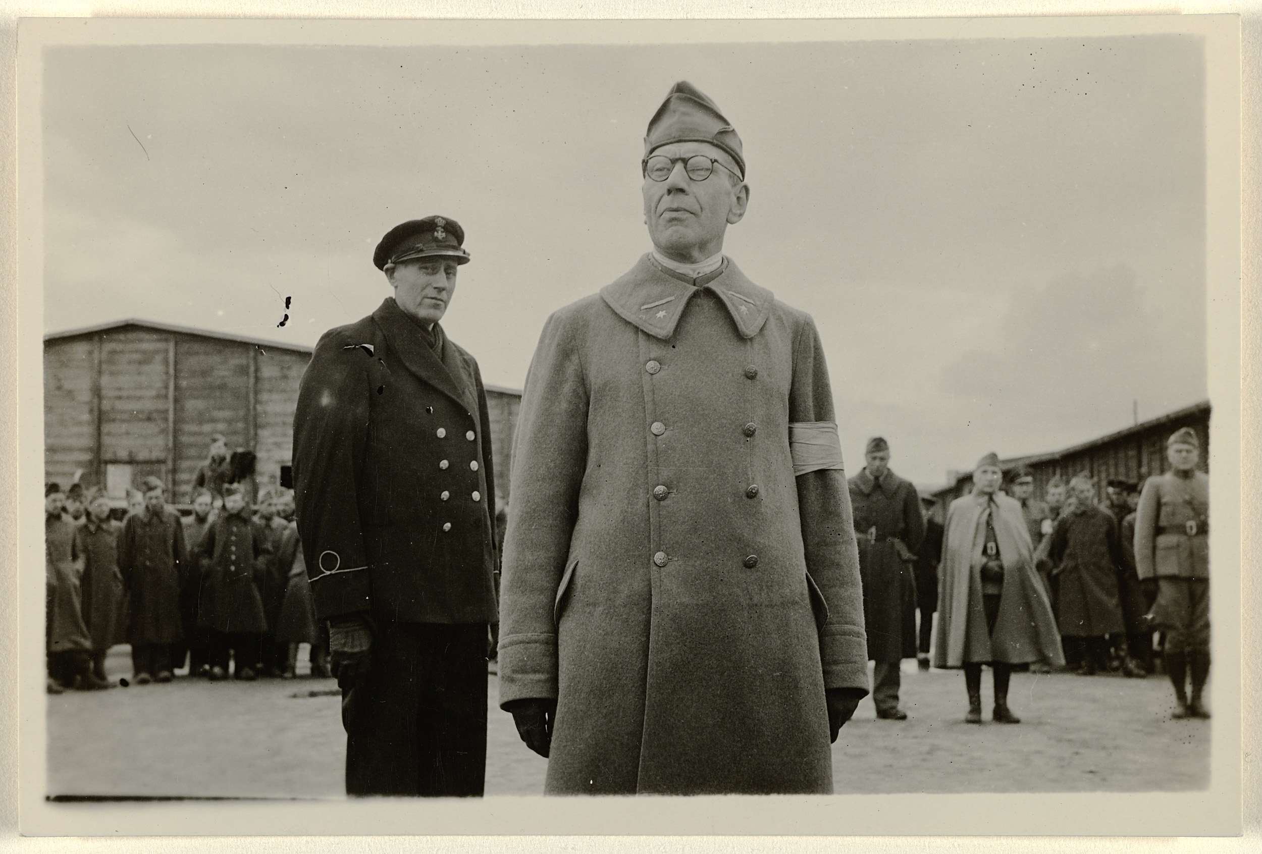 De legerpredikant voor de Nederlandse krijgsgevangenen dominee De Kluis en een groep krijgsgevangenen vlak voor vertrek naar Nederland. Onderdeel van een groep foto's gemaakt door Dick van Maarseveen in het Duitse krijgsgevangenenkamp Stalag IV B in Mühlberg in de periode 1943-1945.