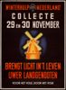 Collecte 29 en 30 November - Brengt licht in 't leven uwer landgenooten. Voor het volk, door het volk - Winterhulp Nederland Oproep voor donatie aan een collecte. Winterhulp Nederland (WHN) was een organisatie die zich tijdens WOII inzette voor hulp en ondersteuning van behoeftigen en zwakken, veelal door geldinzameling via loterijen en collectes. Deze hulporganisatie, in oktober 1940 opgericht naar voorbeeld van de Duitse Winterhilfe, werd ook wel gebruikt als nationaal-socialistisch propaganda-instituut. Affiche ontworpen door Ervaco, uitgegeven zonder W.H.N. nummer. Afgebeeld is een gele molen op donkerblauwe achtergrond. Op dit affiche is de metafoor van het brengen van licht in zowel tekst als beeld gebruikt. Linksonder is de ontwerpstudio vermeld: 'Ervaco'